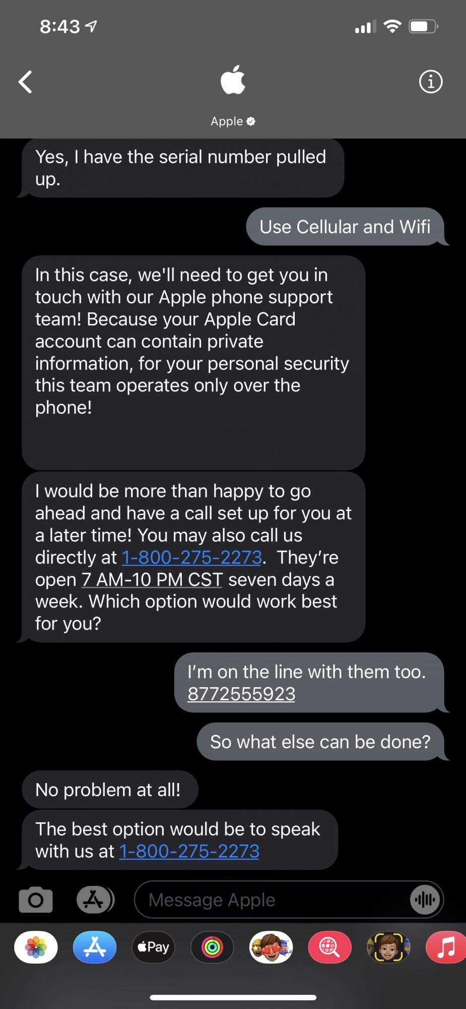 The error was still there when I attempted activating my new physical card. Well, 5 hrs!!! of being on many chats and calls with Apple/Goldman Sachs. I had to verify my information and repeat exactly the same thing over and over again to every agent I was transferred to! As if they don’t have on their devices or cannot read notes/chat history etc. and as if the previous agent wouldn’t introduce me to them.