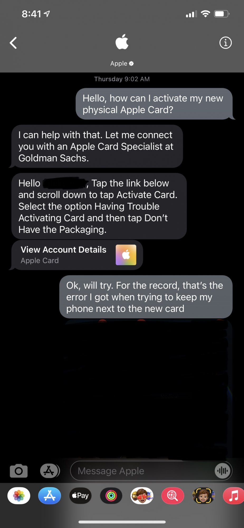 Since my #applecard lost its nice look, after a year of use I decided to order a replacement. Got a new card that wasn’t activatable. It was displaying an error. I chatted with #Apple/#GoldmanSachs support and the person on the line did something that deleted my physical card section completely from my Apple wallet.