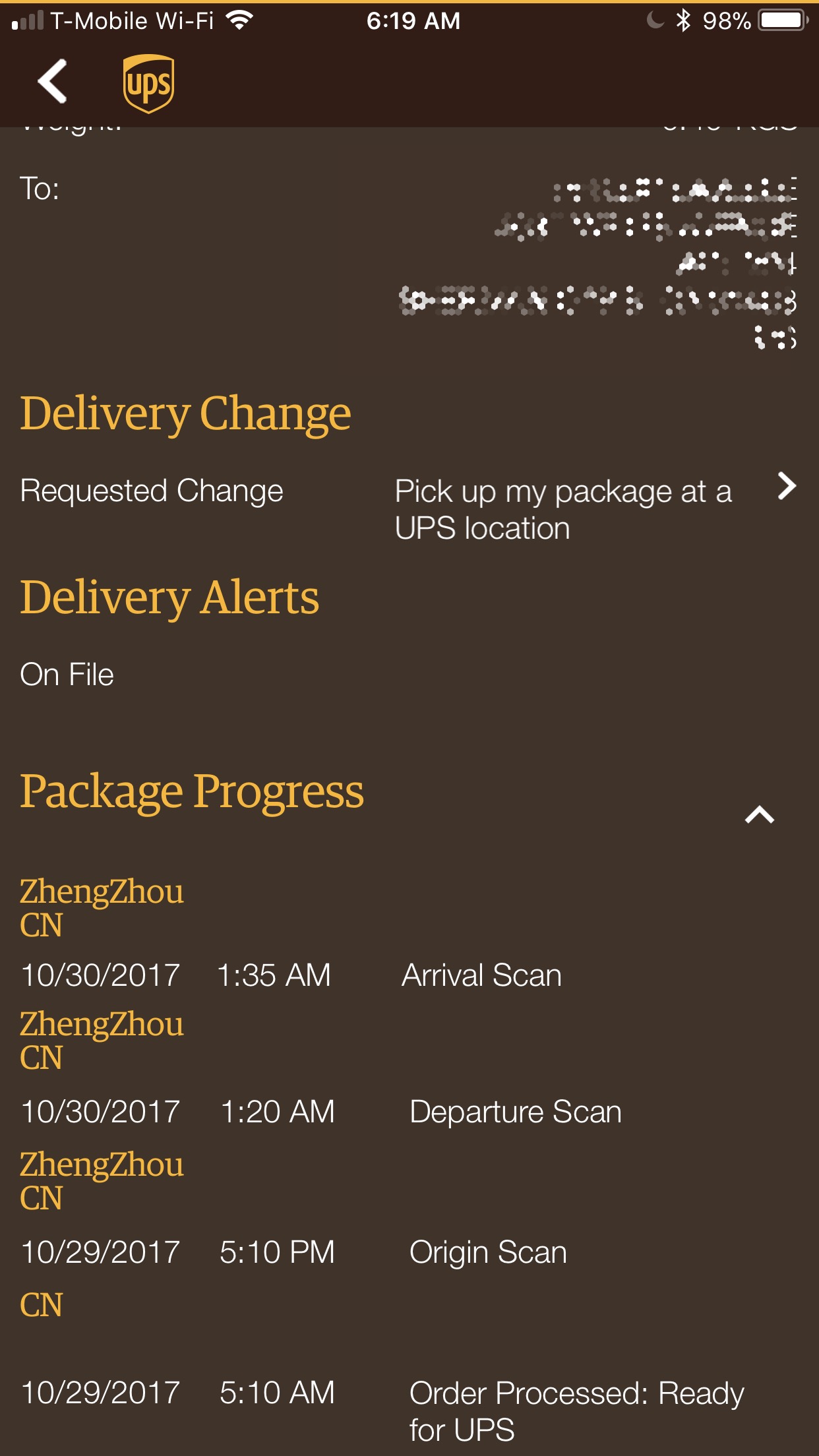 Just spoke with UPS on the phone, and they said as long as you make the request to Hold for Pickup BEFORE it registers a Destination Scan on the tracking, there will be no delay. Once the Destination Scan takes place, they cannot guarantee that any changes will not delay the delivery date until the Change Request has processed. Sometimes they are able to still meet the same date, but she said the earlier you request it, the more likely it is to be still on time. My request to Hold for Pickup is still pending, but the UPS International department (1-800-782-7892) assured me that it will process today without any effect on the delivery date, and it will be ready for pickup ~8:30AM on 11/3Oh shoot! I did it early too! Why did he have to wait? Did he pick a CC or a UPS Store? Argh