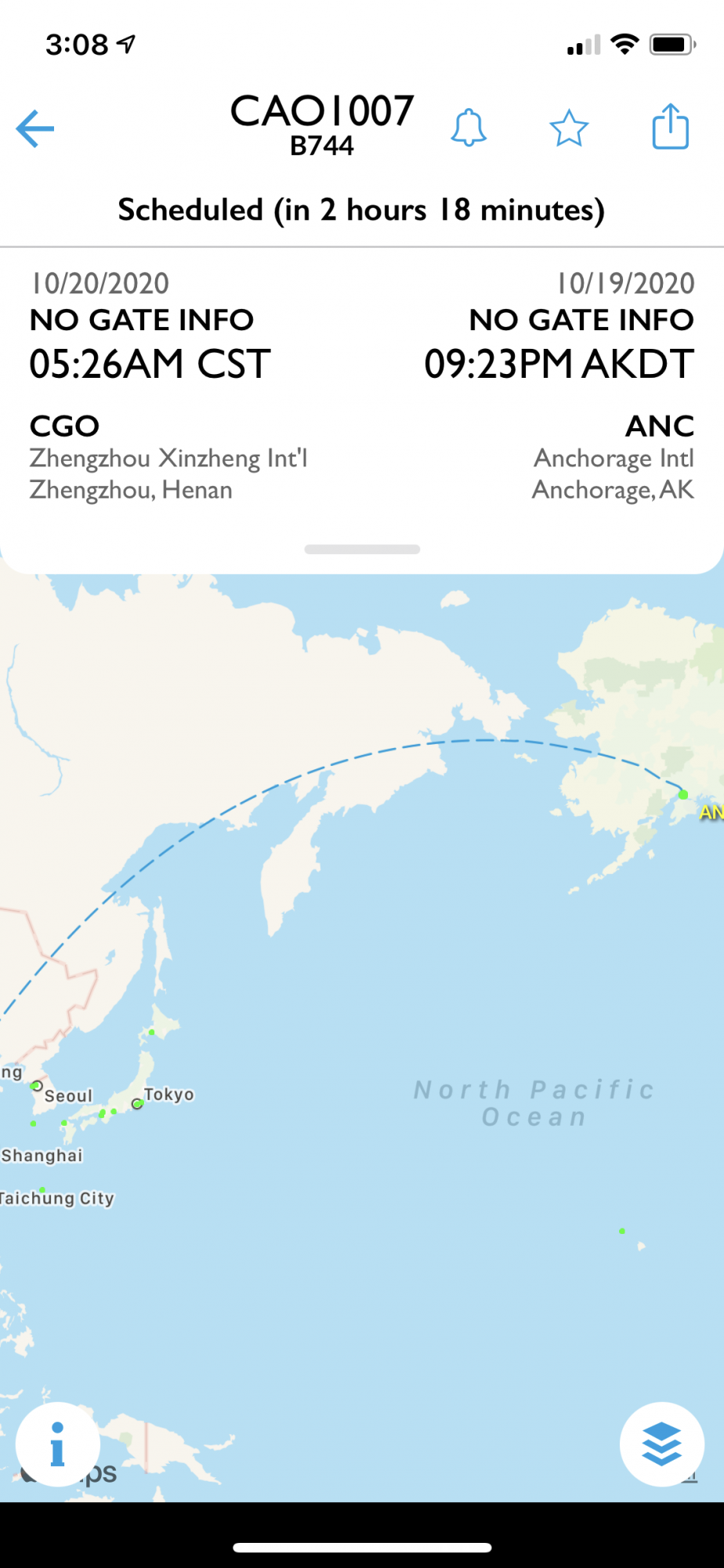 I wonder if 11:57 scans are getting on this charter flight.A new (non-regular) appearance on the cargo flight list from CGO to ANC: Air China Cargo flight 1007. Just got shuttled from PVG to CGO about 1 hour ago. Departure from CGO is expected at 5:26 am local time.