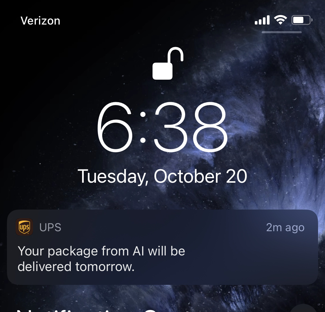 My tracking got updated to reflect Oct 23 delivery, as expected, but did get this notification from UPS just now, lol.