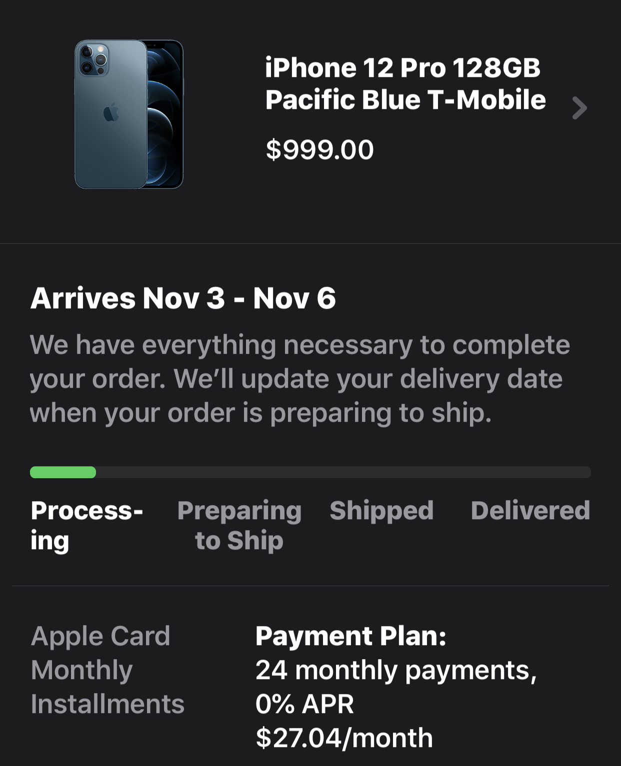 128GB Pro 12 shows Preparing to Ship - Delivery 11/3-11/6