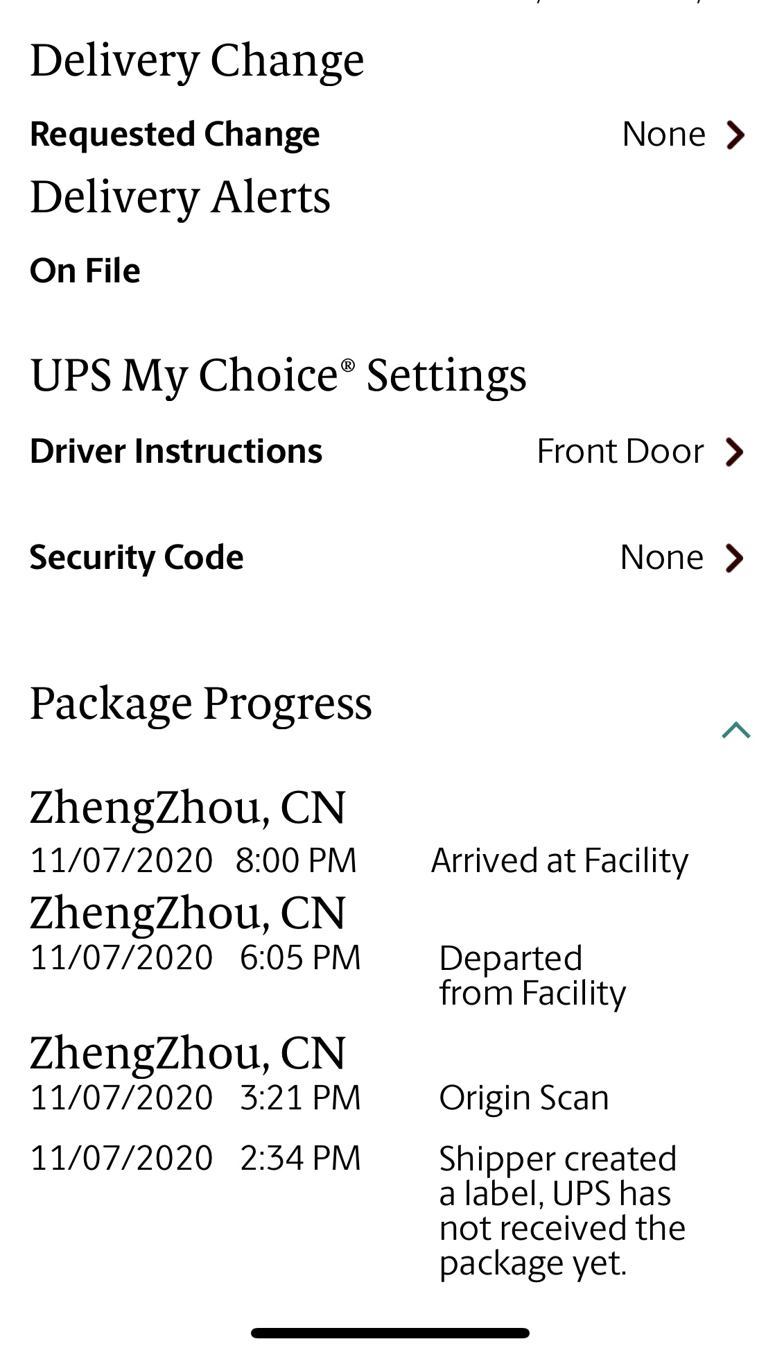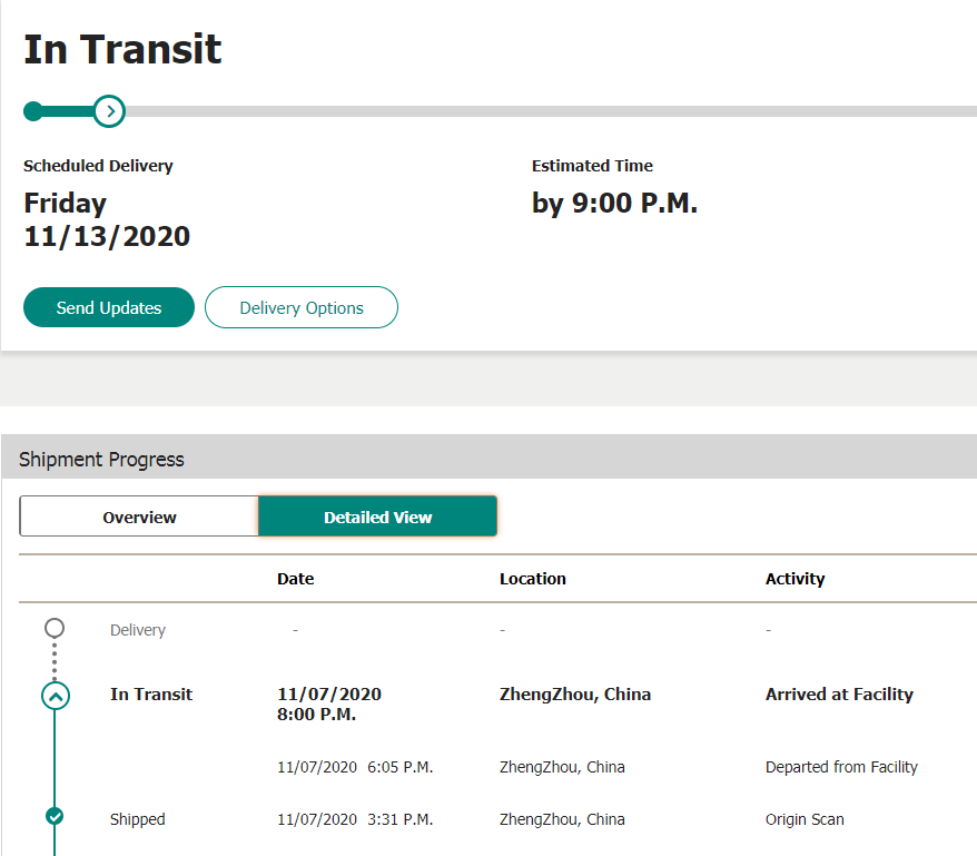 Last update was 2.5 hours ago when it arrived at the next facility in ZhengZhou.![]()