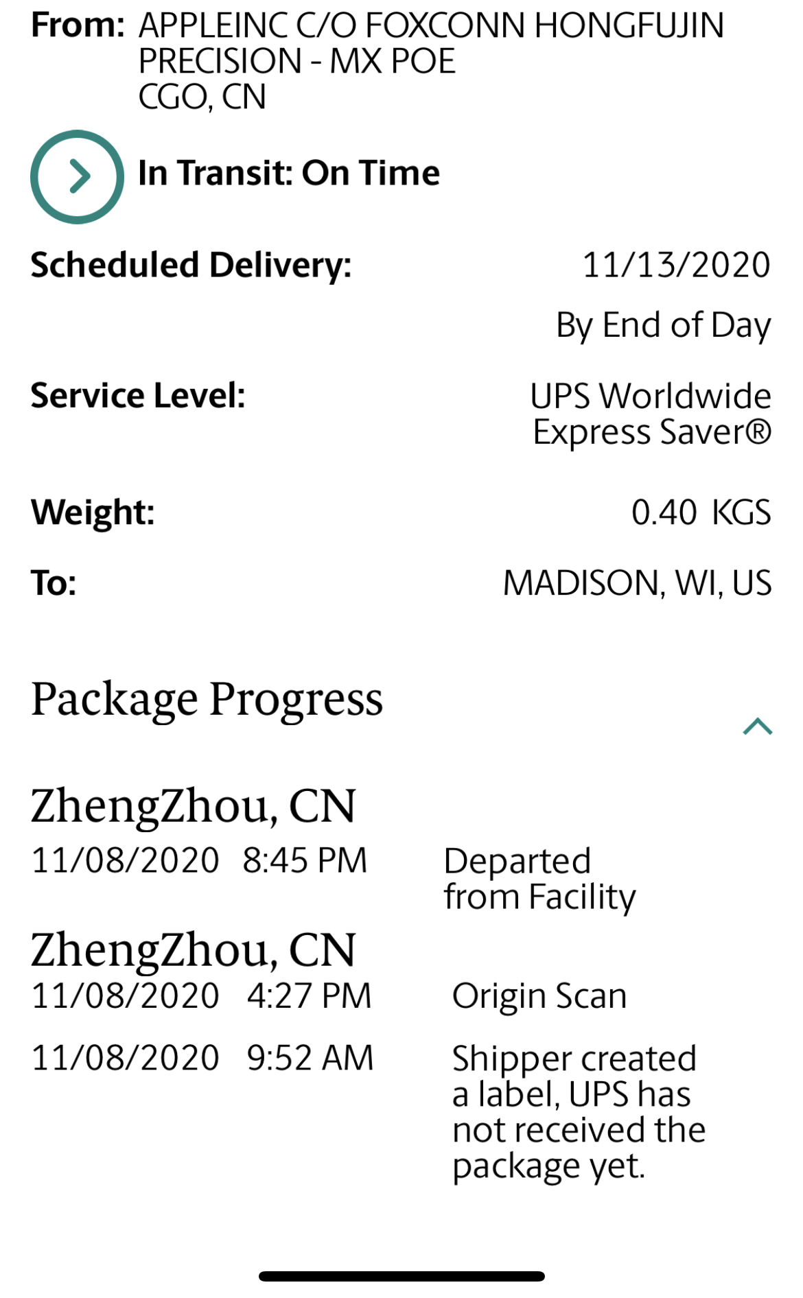 I have a 12 Pro Max (ATT) Gold 256 that departed at 6:06 pm in ZhengZhou and then shows an arrived at the same facility at 8 pm same date (both on 11/7)....no movement since yesterday.