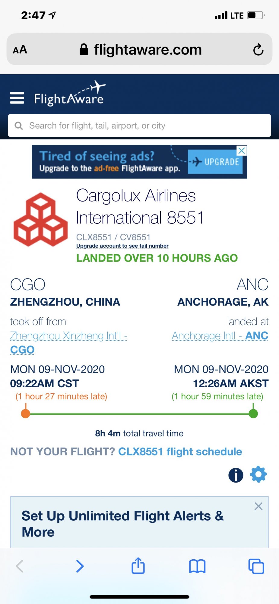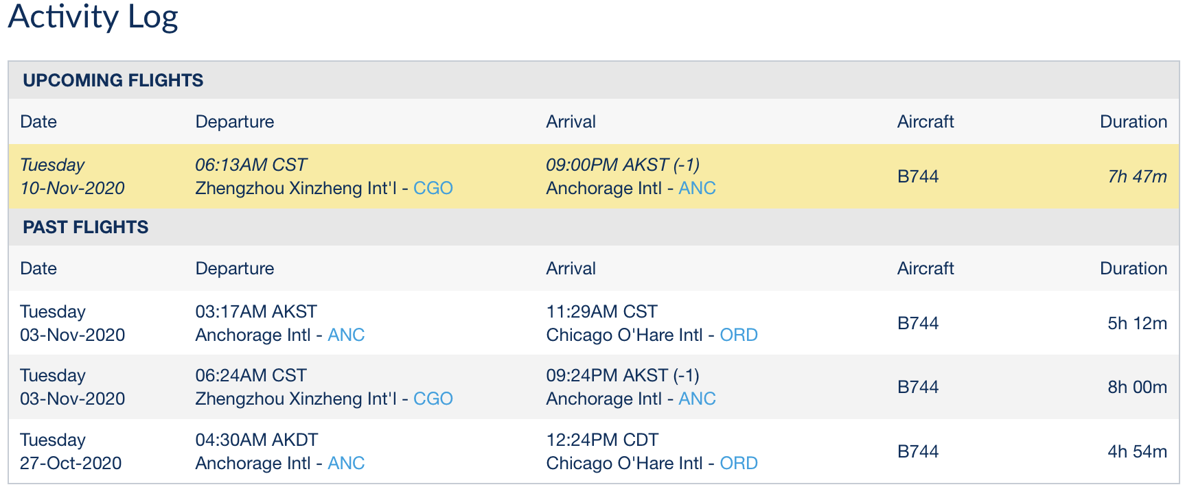 Looking more into the Cargolux flight’s activity log, it’s expected to go from ZhengZhou -> Anchorage -> Chicago.