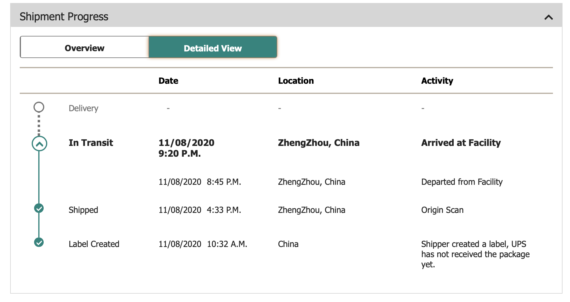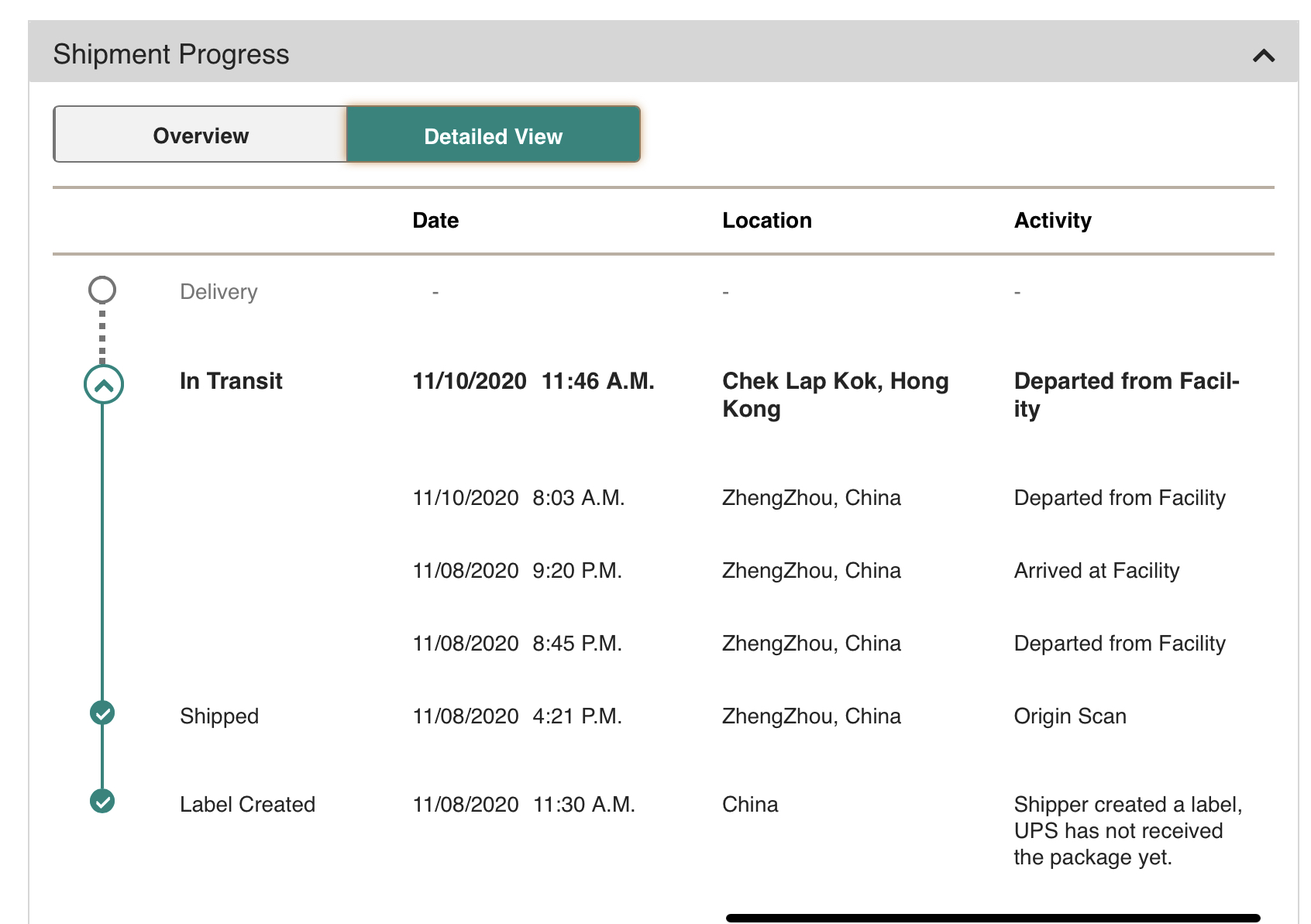 It says In Transit with delivery on Friday November 13th, I just can't seem to access the detailed list of exactly where it is which isn't a big deal as long as its saying its on the way.