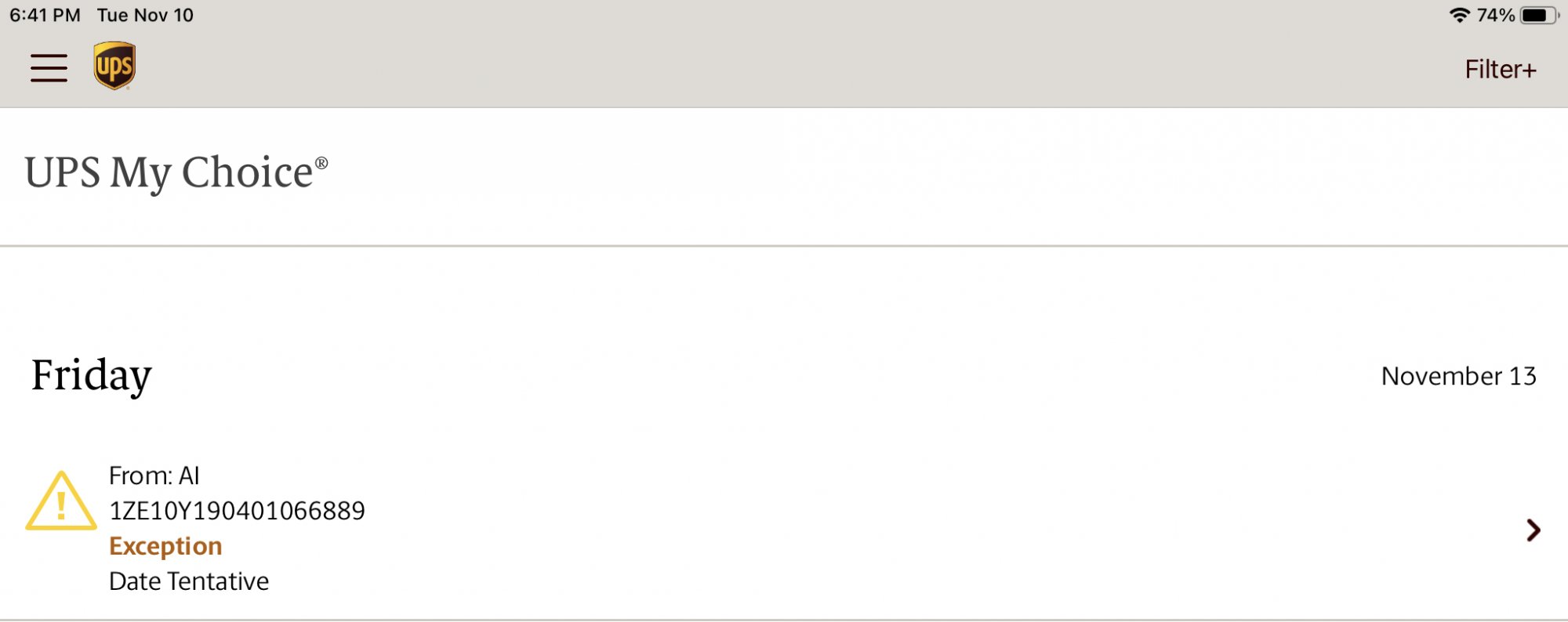 I have this also. (9:20, sitting in China) And only see it on this UPS app I downloaded, nothing mentioned in my desktop UPS My Choice. Still states I will be getting this 11/13.