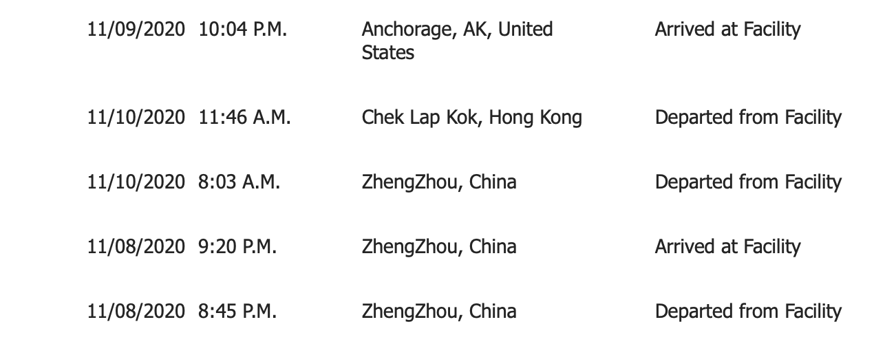 ...CGO (China) to ( Alaska) PANiCImport scan needs to happen tomorrow in Kentucky though. Also, it’s a good roughly 8 hour flight from CGO (China) to ( Alaska) PANC - then - additional 7 hour flight from PANiC to Kentucky.
