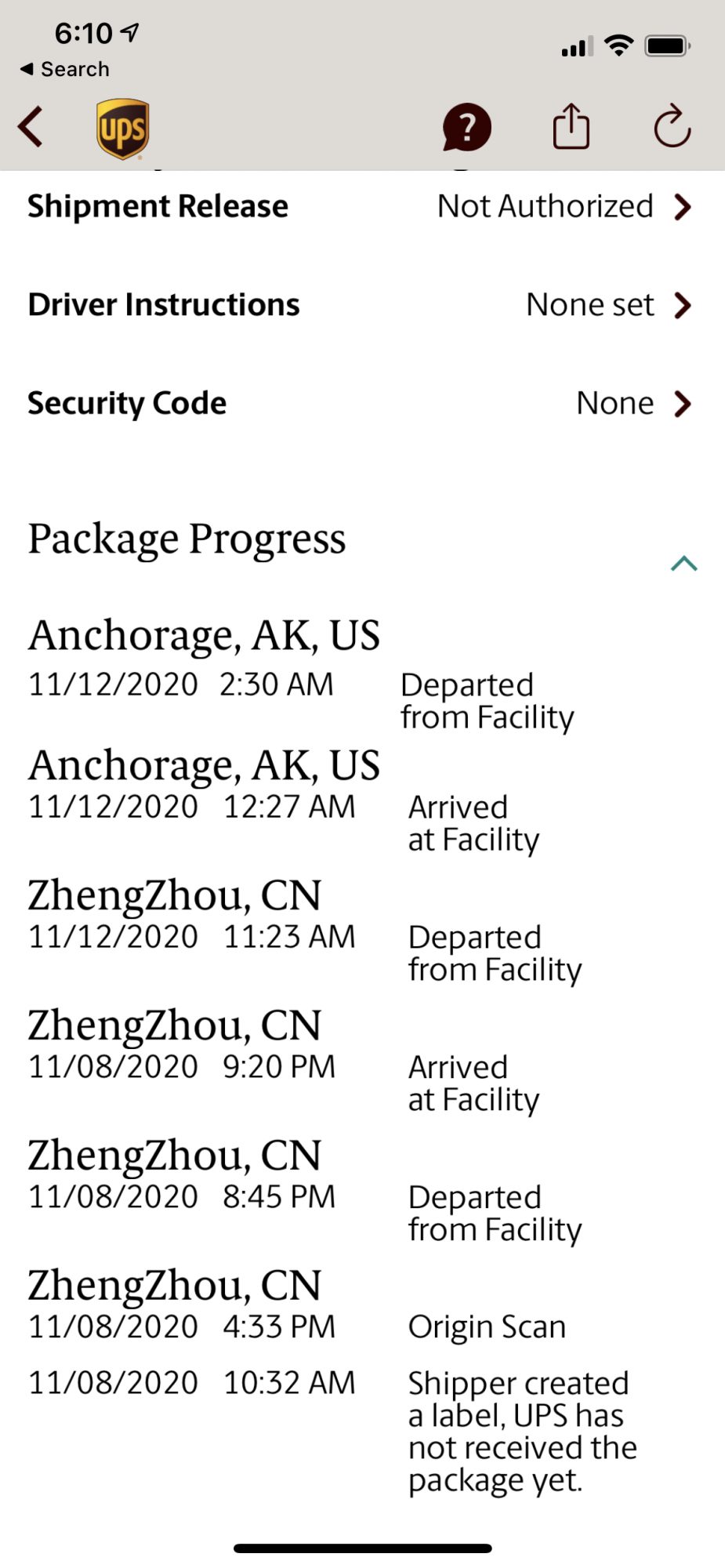 BTW, neither Apple or UPS is handling this tracking well. Apple doesn't have the initial shipped notification from China and UPS provides a bunch of detail at the beginning and then leaves tracking updates alone after the AK flight takes off. They should probably just do an "in transit" if they're going to do only partial detailing. But that's just me.