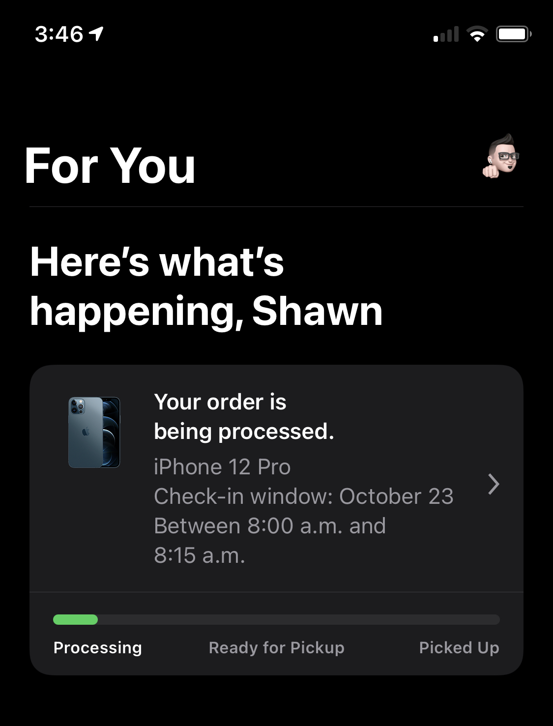 Not that the demand for watches = iPhones, but when ordering my Apple Watch SE last month, the series of delivery dates got earlier & earlier, from order confirmation to shipping estimate to shipping notification. Hope yours gets bumped up in similar fashion, especially given the literal timing. I think I completed my order for a silver 12 Pro 256GB at about the same time via the Apple Store app on my iPhone, and I got an Oct. 23 delivery date.