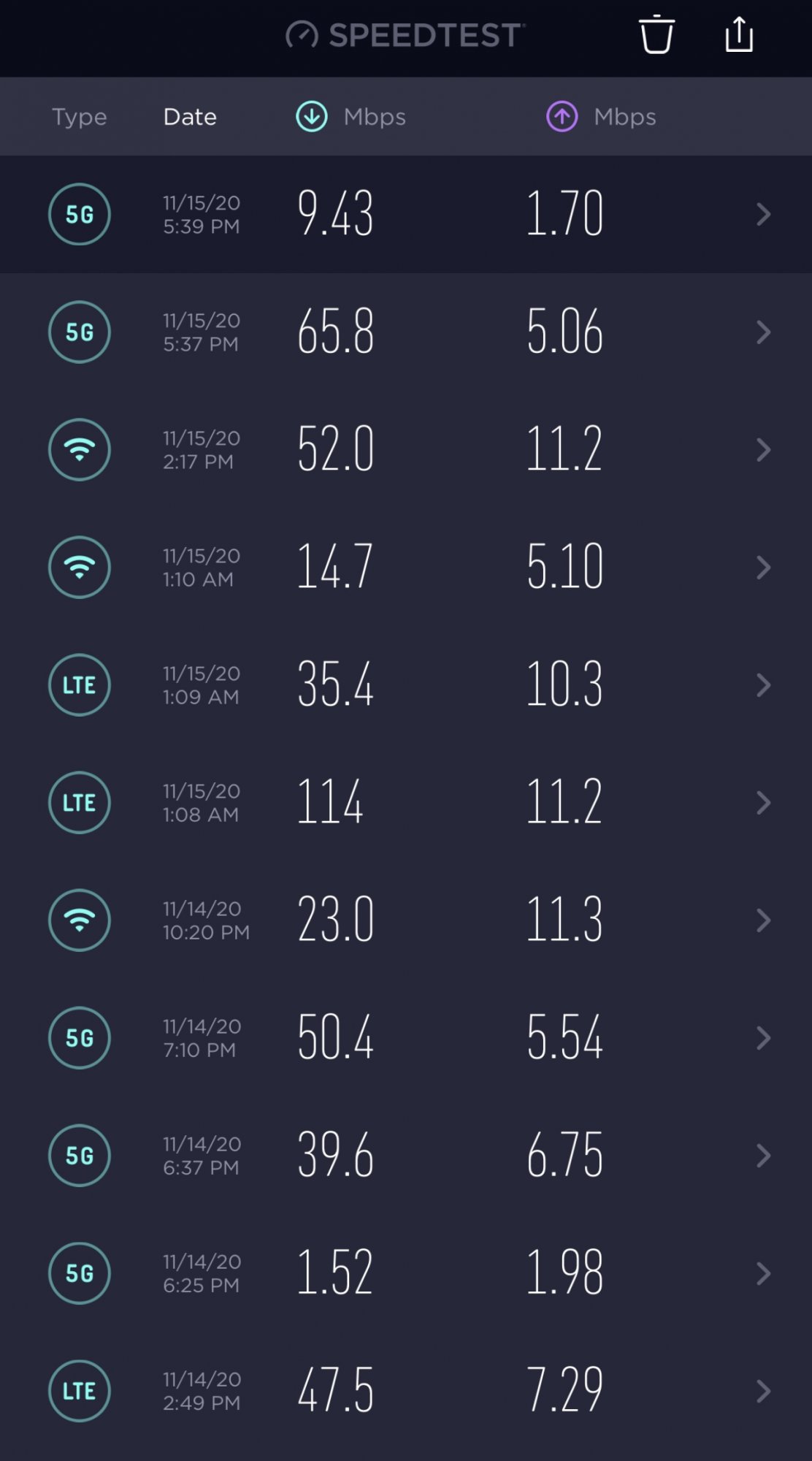 How many bars do you have yours looks like the weak and fluctuating signal other night in rain and wind on my marginal edge area to the AT&T towers I am between. I saw some fluctuation then that looks like this but never got over 50 on good fluctuations. But where am am 3 or 4 bars elsewhere i get 120 to 160 Mbs not huge but better than my old LTE that was around 75-80 with 4 bars in townOh yeah, those are awesome! I’m seriously starting to think my local cell towers are drunk! 🤦🏼♀️