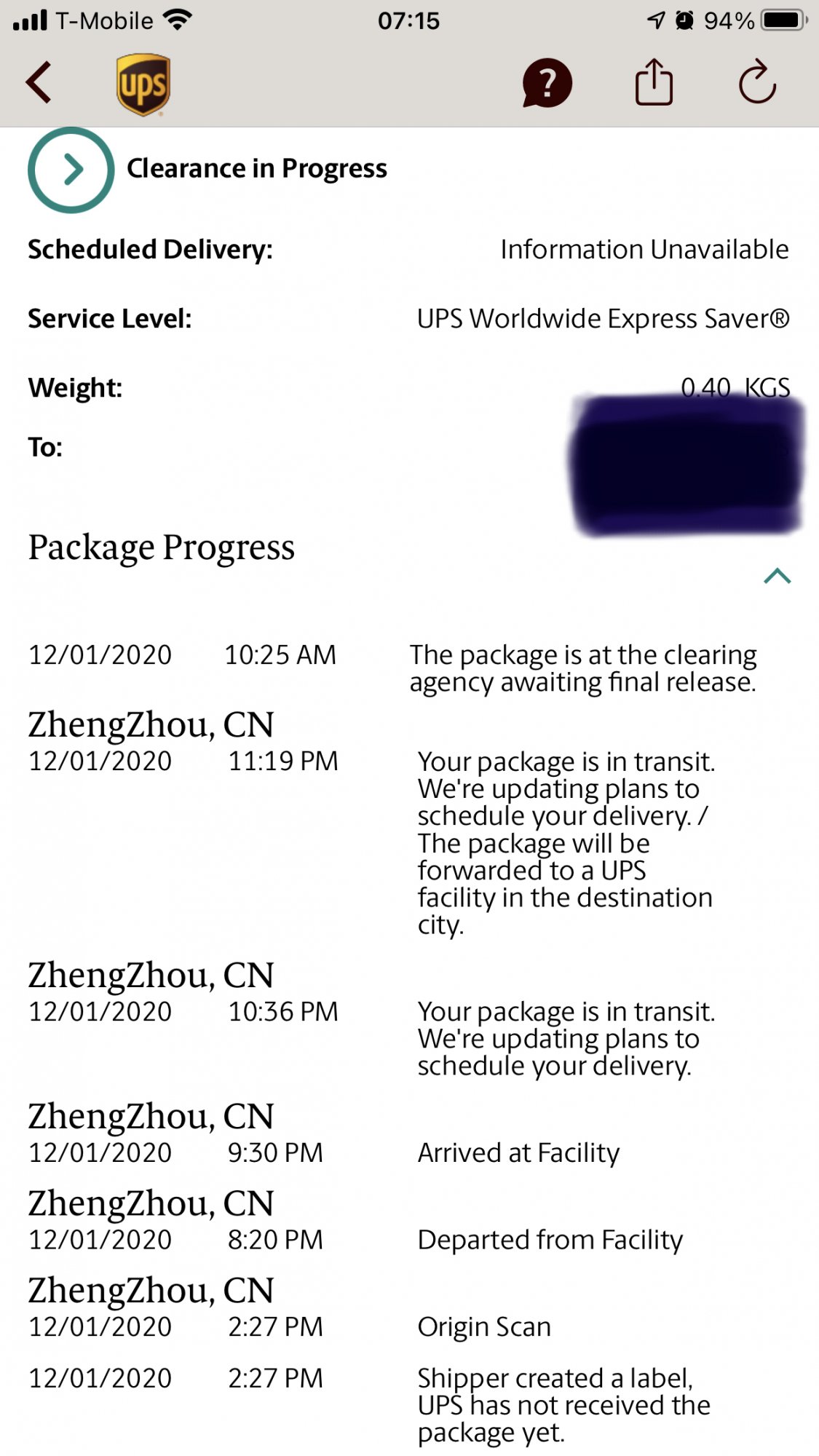 As per what it showed on UPS tracking, it got shipped on Dec 1st from ZhengZhou and said in transit only to change later to say that package is awaiting final clearance.