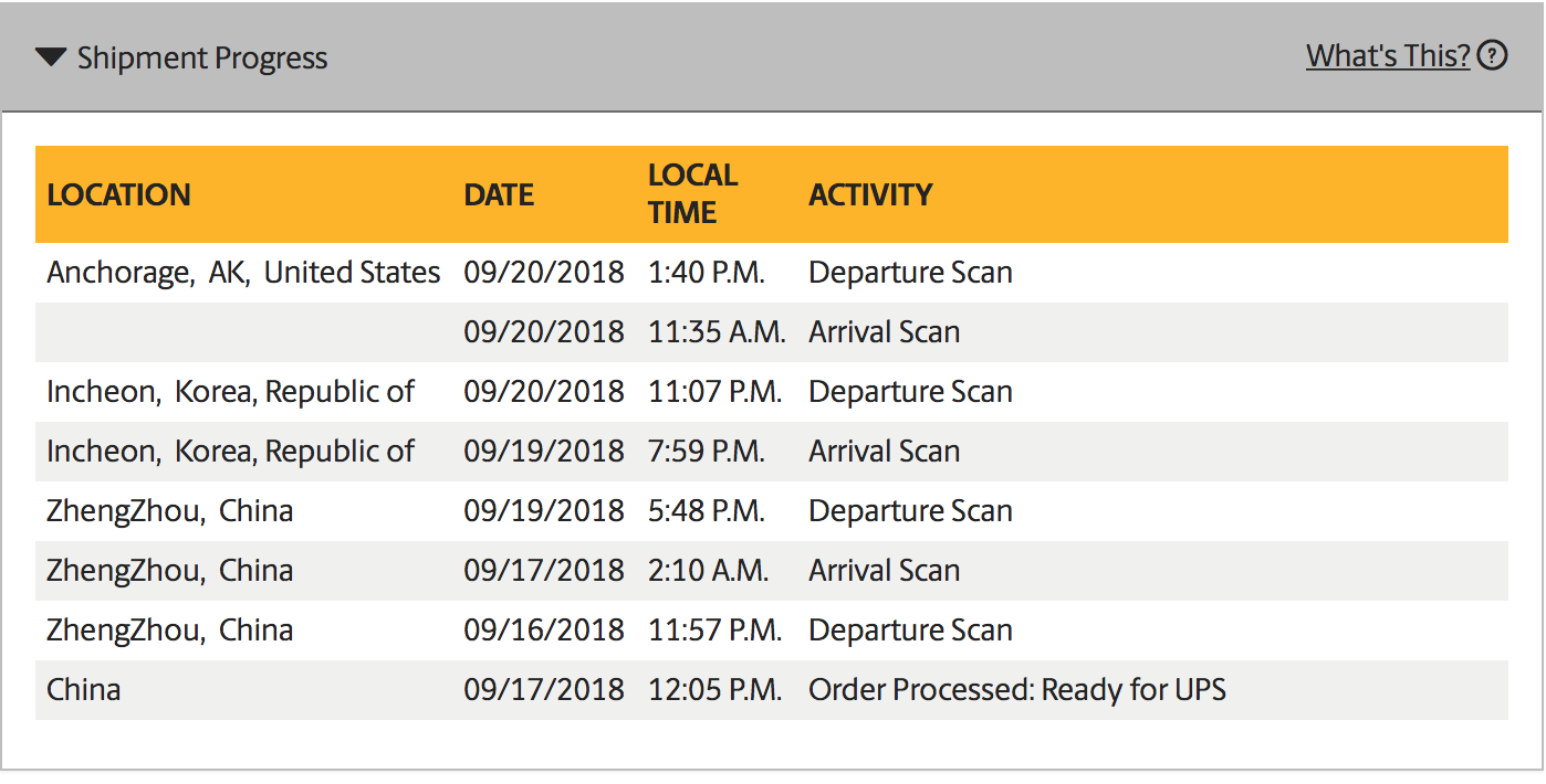 China 09/17/2018 3:43 P.M. Order Processed: Ready for UPS