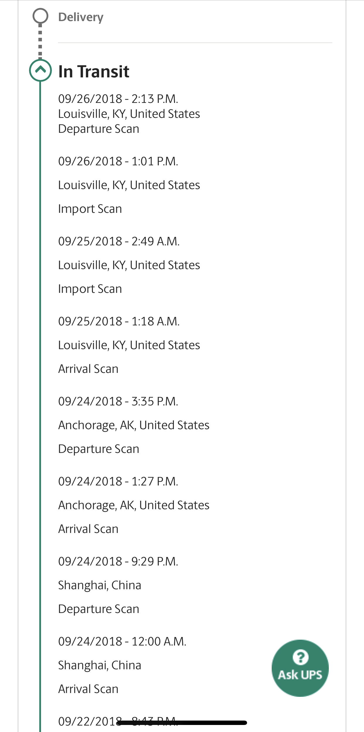 Actually there are three flight from Anchorage to Louisville at about same time, UPS105, UPS109, UPS99. They are all arriving between 11:45pm to 12:50am. I am waiting for my last one (max), currently showing for tomorrow delivery. Mine showing Anchorage departure scan at 4:45pm (EDT). Hopefully on one of these flights.That is what I am wondering myself. Mine is going to Los Angeles after Louisville, where is yours? According to Flight Aware the next flight from Louisville to LAX is at 3:30AM with a landing in Los Angeles at 4:35AM tomorrow. Which would hopefully mean it will be at the UPS hub ready to pick up tomorrow at 8AM........That is if it doesn't get stuck in Louisville for a day........
