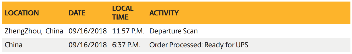 But it’s possible that the departure was via ground to another city where UPS operates and its actually still in China moving in the system.There were no other flights between those two airports even close to the scan time. I’m guessing that’s why.
