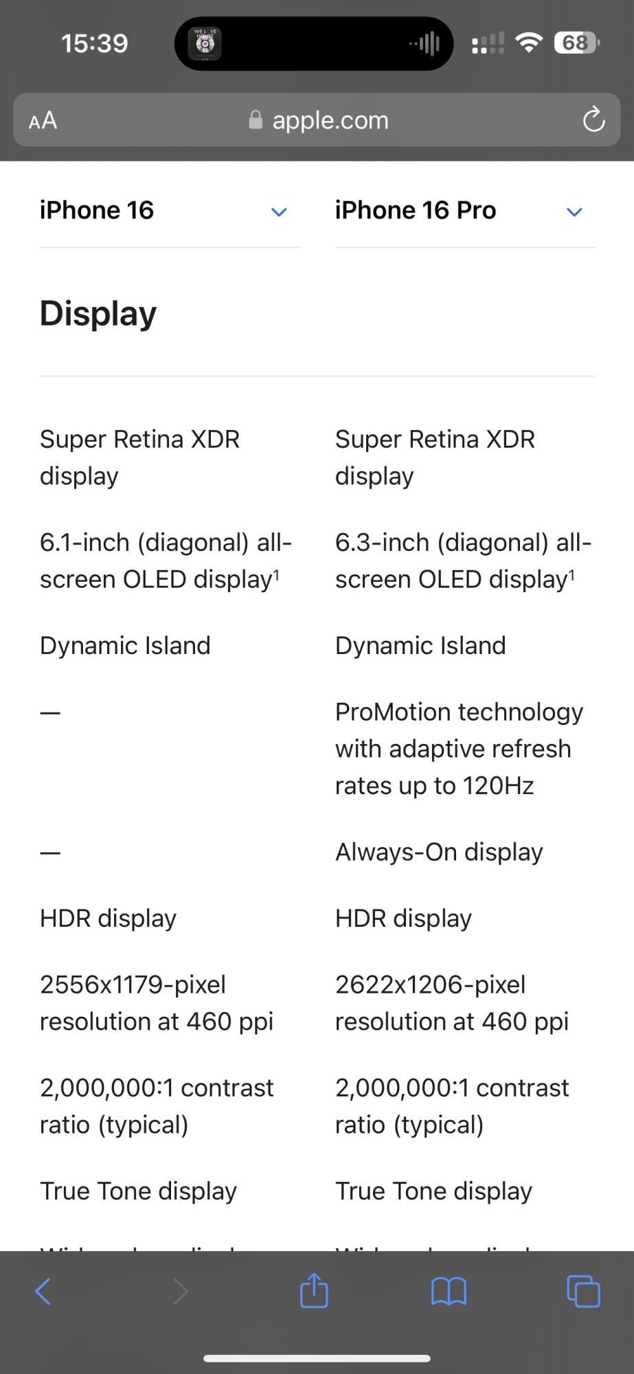 Oops. Sorry for the wrong info, I was checking the comparison table too and I really think it showed it had AOD 😅Thanks. Yes, I checked with Apple and they confirmed that the iPhone 16 does NOT have always-on display, so my original post was correct after all. Appreciate you providing this comparison.