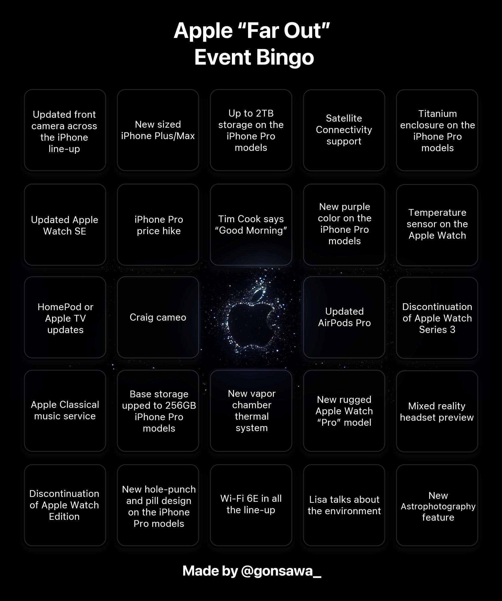 Hello, in anticipation of the “Far Out” event, I made a little bingo card, based in the latest leaks and rumors.