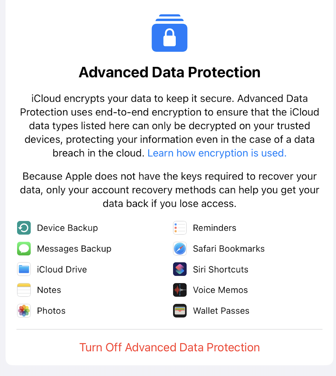 I got disconnected, and when I had to reset everything, it seems that Apple deactivated my Advanced Data Protection. I had Advanced Data Protection on since day one and had never touched it. The strange thing is that when I click on it to activate it, the next dialogue shows it as activated.