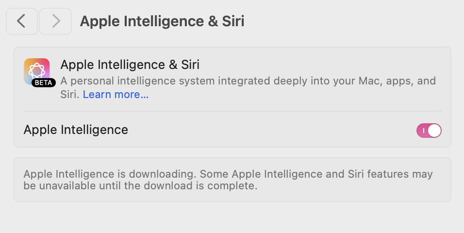 Then try and enable Apple Intelligence from system settings (you might need to quit and restart system settings for it to show up)
