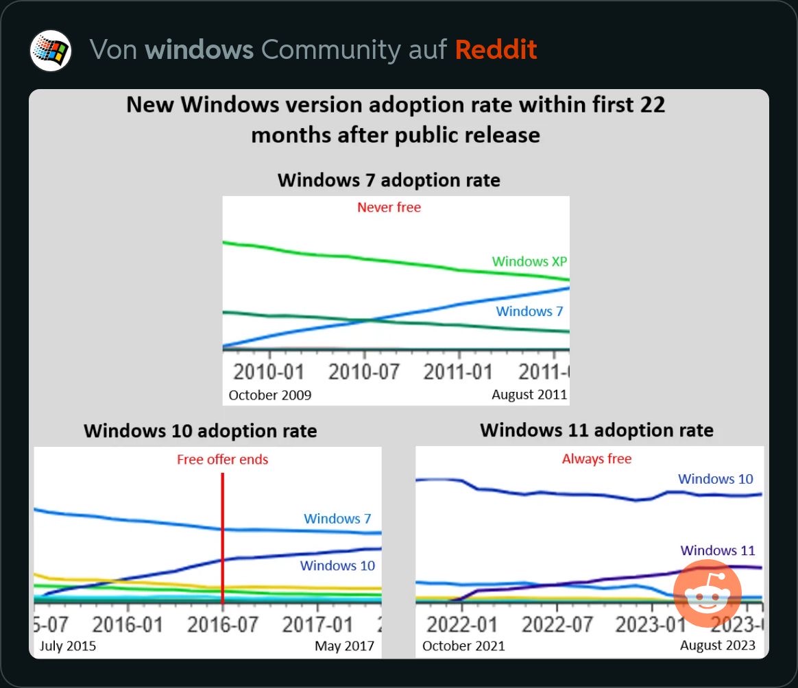 There isn’t even a proper understanding of what future Windows is supposed to be. It’s just one failed experiment after another. This makes it much easier to just keep running old Windows to maintain compatibility. And that’s why the adoption rate for new versions of Windows keeps shrinking.