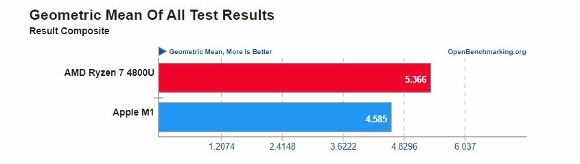 The geometric means of all openbenchmarking.org benchmarks between AMD 4800U and Apple M1