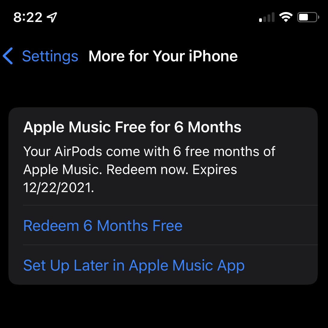 I purchased my 2nd Gen AirPods just after release (March 2019 to be exact) and after updating to iOS 15, I am now being told that “Your AirPods come with 6 free months of Apple Music. Redeem now.” This seems strange to me since I bought my AirPods 2.5 years so ago, and am just now getting this pop-up in Settings.