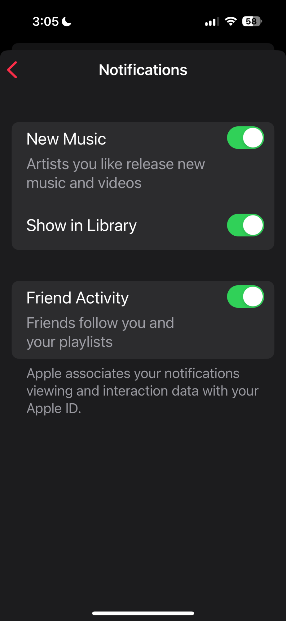 In the past few days, I've noticed a peculiar occurrence: the absence of new Apple Music push notifications for recently released music. Despite verifying that new tracks from artists I follow do indeed populate the "New Music" section of the "Listen Now" page, I've yet to receive any corresponding notifications on release days, as I had previously. Furthermore, I've confirmed that new music notifications remain enabled in my Music settings (see attached screenshot). I can't help but wonder if this issue might be related to the recent OS 17.3.1 update, as I haven't observed any new notifications for approximately a week, coinciding with its release. Has anyone else experienced this anomaly?