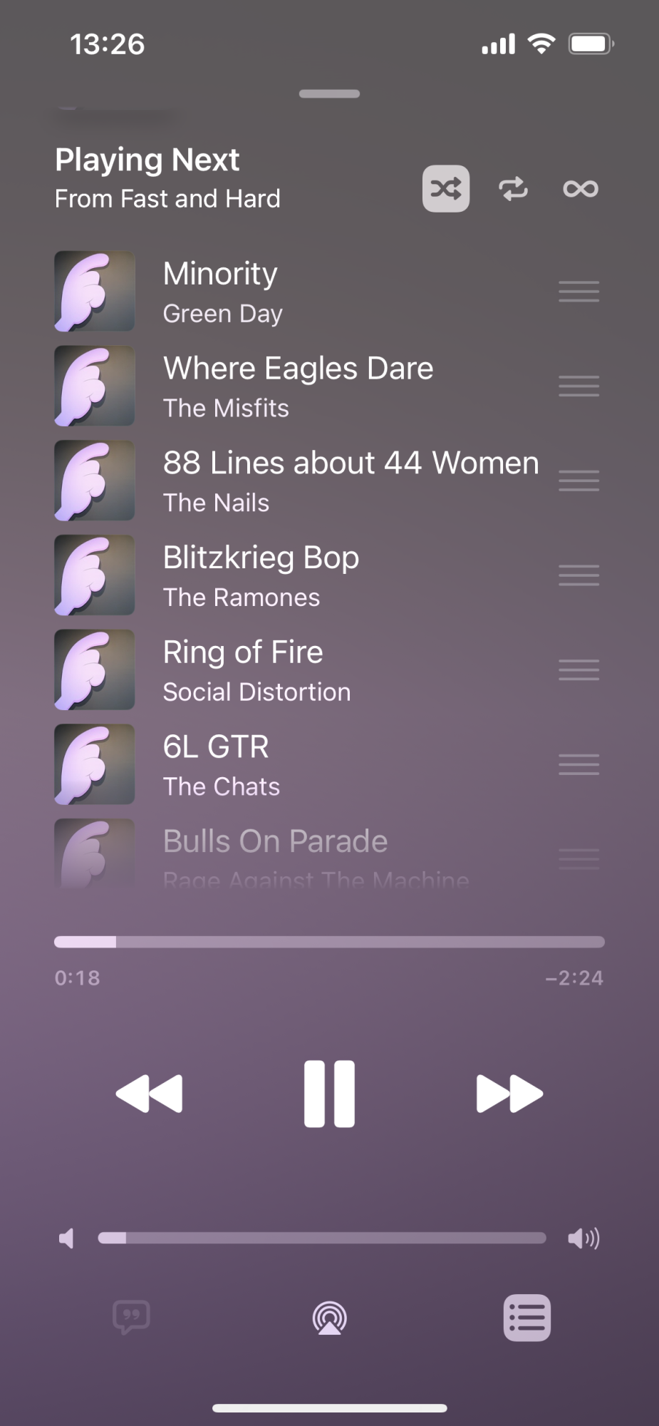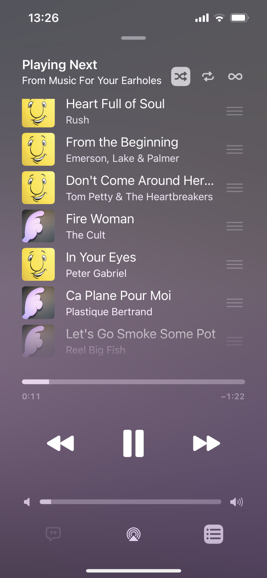 The screenshot Playlists shows how my playlists are organized. The screenshot Fast and Hard shows how normally Shuffle works, playing songs in random order. The screenshot Music for Your Ears shows how this playlist, the in shuffle mode is playing songs from Music for Your Ears and Fast and Hard.