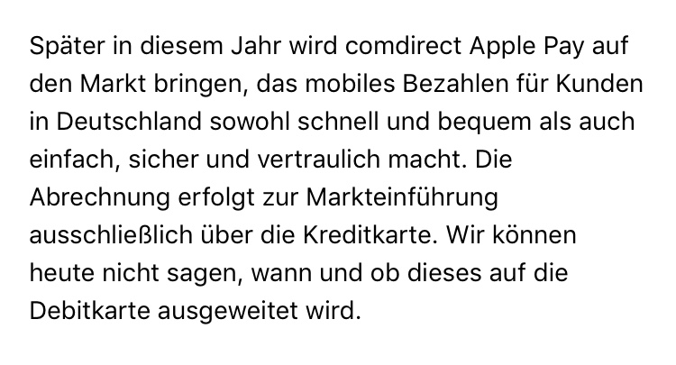 Maybe DB will offer Maestro support as they currently state that a checking account with them is sufficient to be able to use Apple Pay and the “Junges Konto” for example does not include the Debit Mastercard.I asked comdirect which type of cards they will support. This was their answer:
