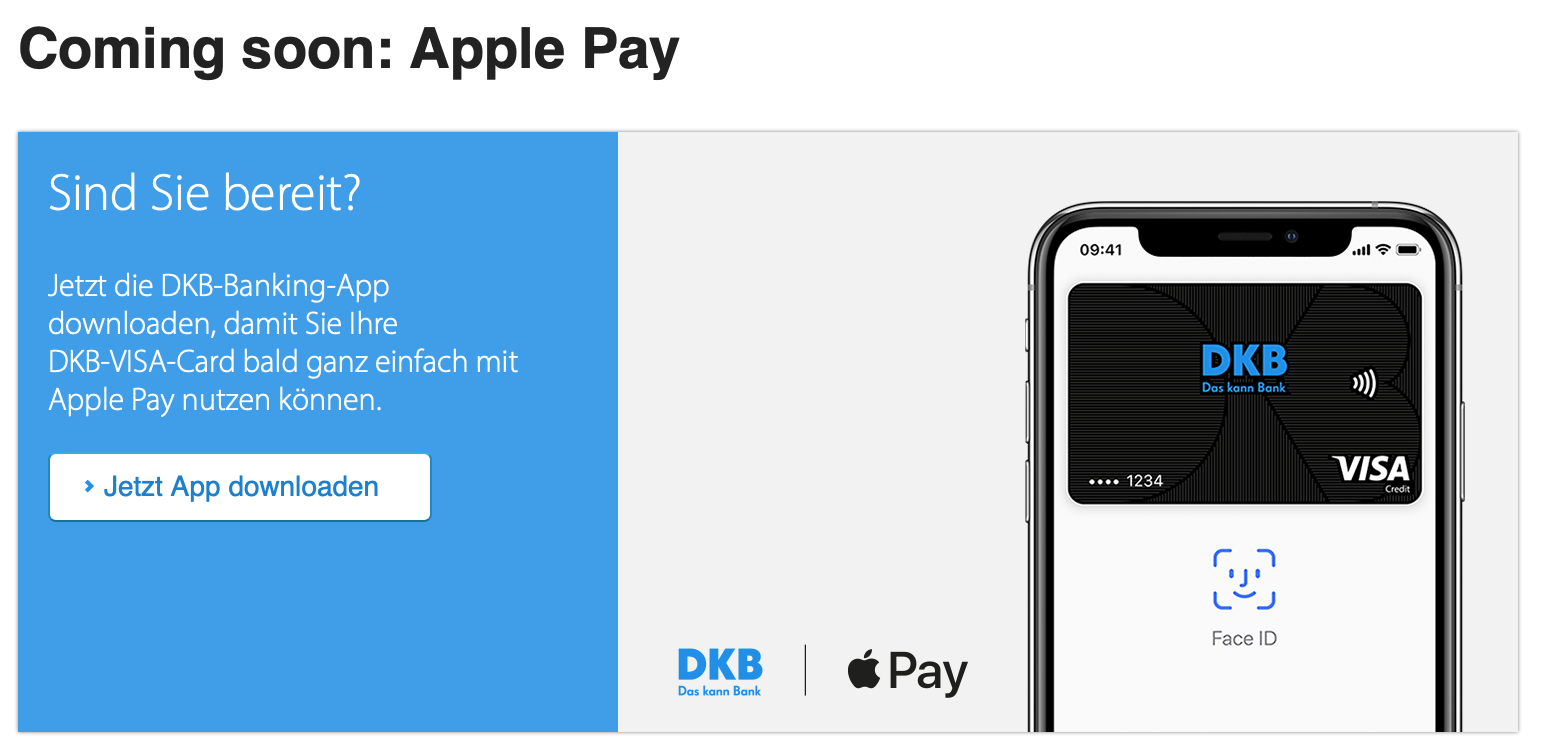 Download now the DKB-Banking App so you soon can use your DKB-Visa-Card with Apple Pay."