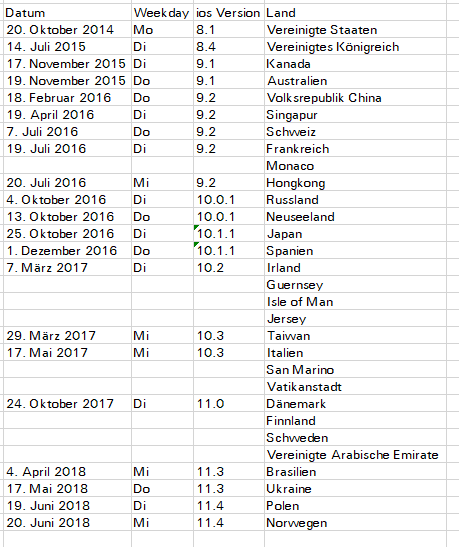 Confirms what I said (apart from the fact possibly Thursday as a launch day). Recently release days mostly Tuesday/Wednesday and an Apple Pay launch has never coincided with the launch of a .0 release. It has with other dot releases, but just take a look at the Skandinavian/UAE launch. Your table also (I can't check everything) has other false information. iOS 11.0.3 was released on the 11th October 2017. So there were 3 dot releases after iOS 11.0 until the launch of Apple Pay there a month later. Apple doesn't usually launch big services (at least in recent times) together with the big software updates.just wanted to confirm this... maybe this List is helpful for you (sorry, it's german):