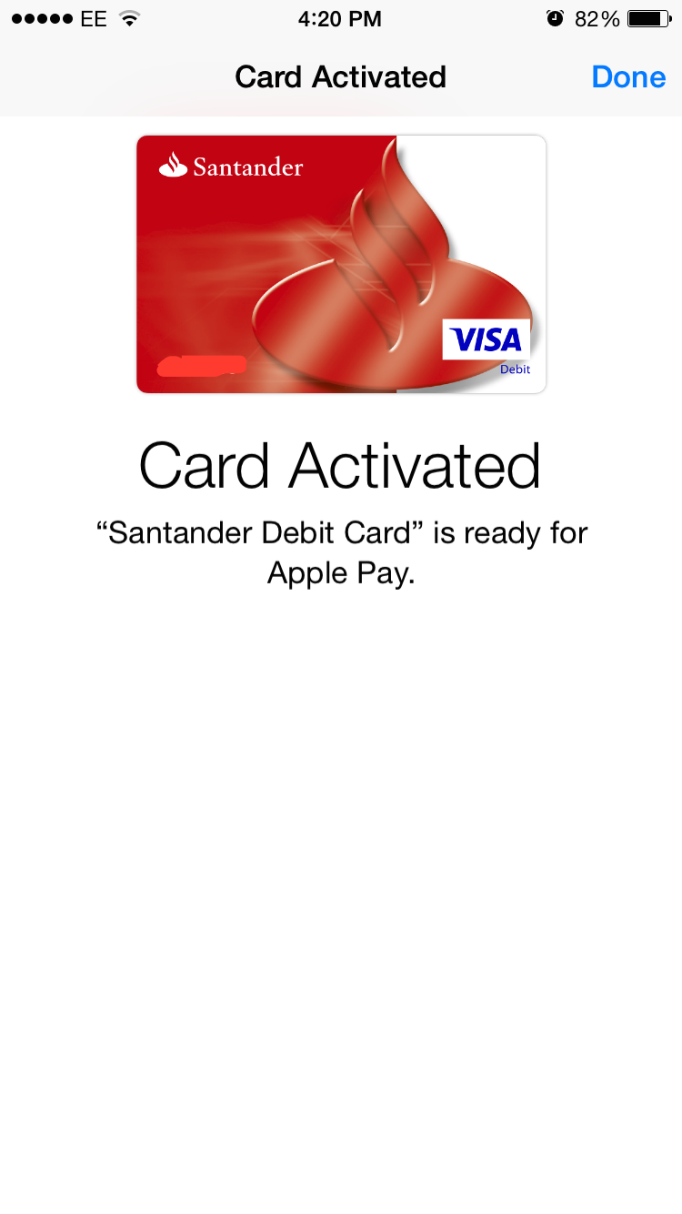 Beat me to it, that's me out for now then, just Nationwide and Natwest I can try...Natwest not working, best of luck to you with Santander, if it activates it should work on payment, no need for any update on the terminal end (unless you want to spend more than £20).