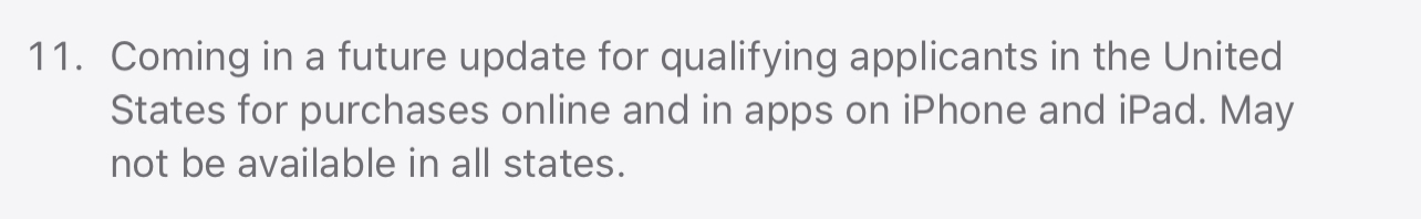 "Coming in a future update for qualifying applicants in the United States for purchases online and in apps on iPhone and iPad. May not be available in all states." (https://www.apple.com/ios/ios-16/)