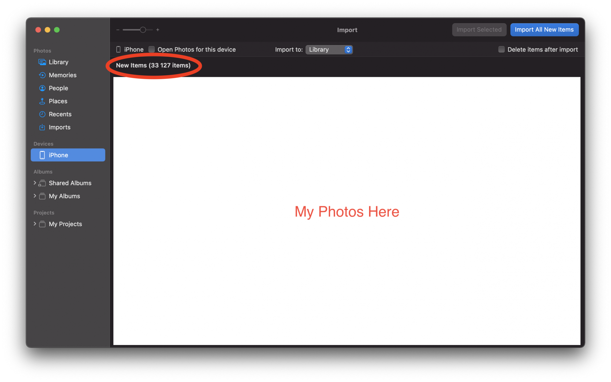 However, when I connect my iPhone to my Mac, it only shows 33 127 items available to import.