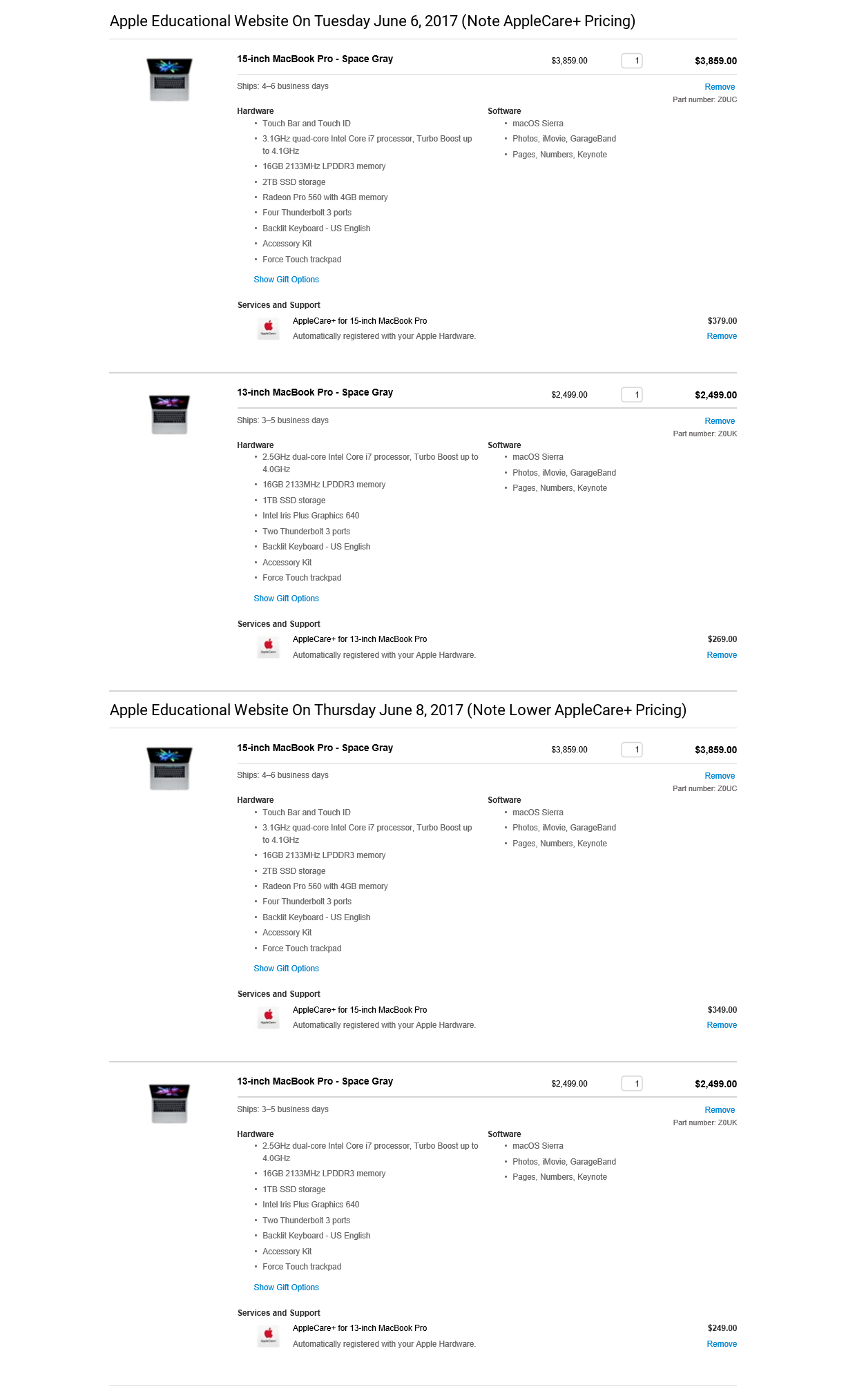 Earlier in the week, Apple's US Education website listed AppleCare+ pricing for 13" and 15" MacBook Pros at $269 and $379, respectively - not applying any discount to the retail AppleCare+ prices for these models.