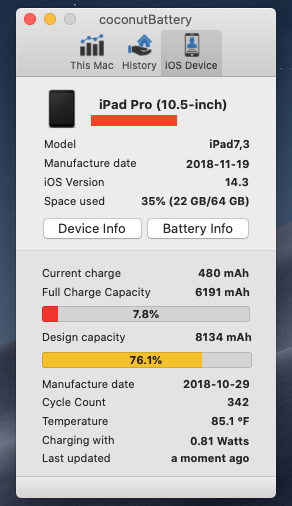 Yes! They will diagnose battery health via phone call to support. They will ask you to go to privacy setting then click ”share analytics data” with that switched on they will remotely connect to your iPad and run a short digital snapshot of your iPads performance..health etc. Usually done in minutes.I have the same problem with my iPad Pro 10.5. When this thing was still under warranty and the battery performance was rapidly degrading, I went to Apple and they looked at me like an idiot when I tried to explain the situation. Fast forward 2+ years and I am stuck with an iPad that typically lasts 3-4 hours, perhaps a bit longer if I bitterly do nothing but light browsing. At only 342 cycles, coconut shows 75-76% battery life.