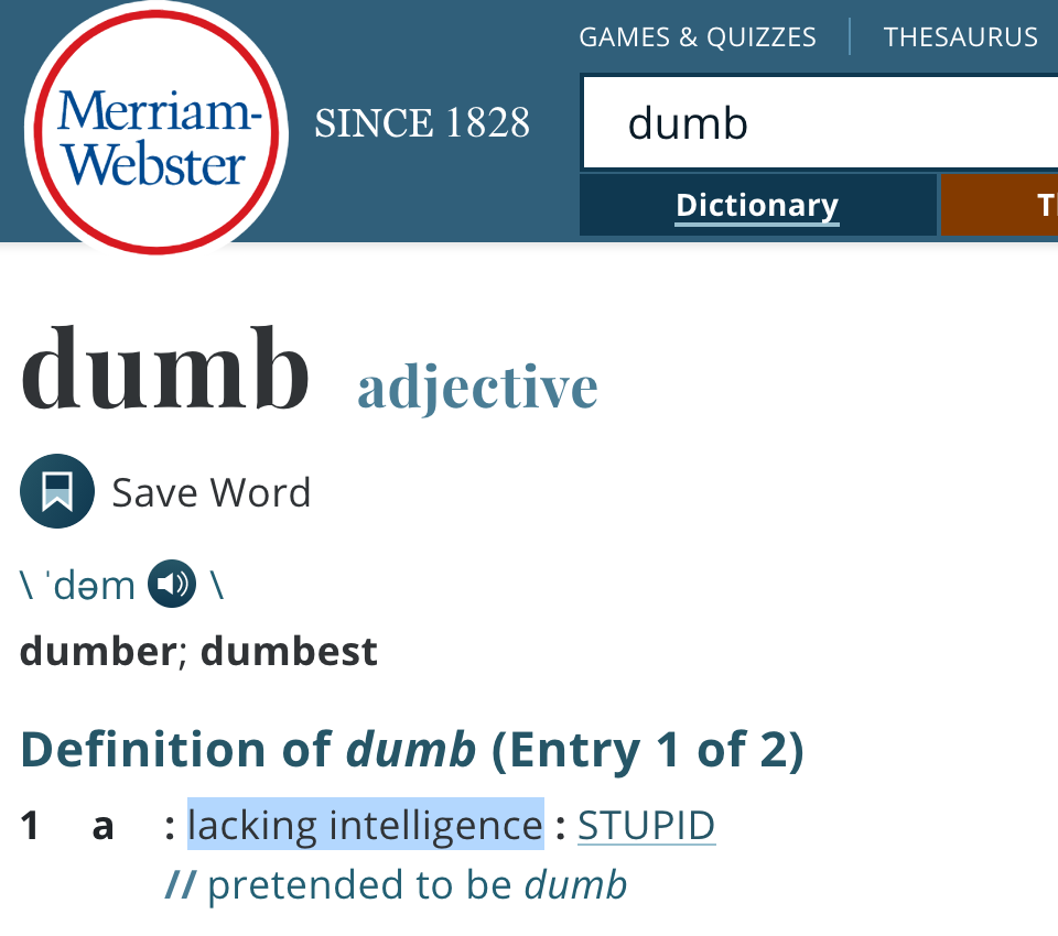 In my search, dumb as you define it, shows up as the 3rd entry and also as 'Informal North American'- so basically it's the wrong definition but it's accepted because people are too stupid to know better.
