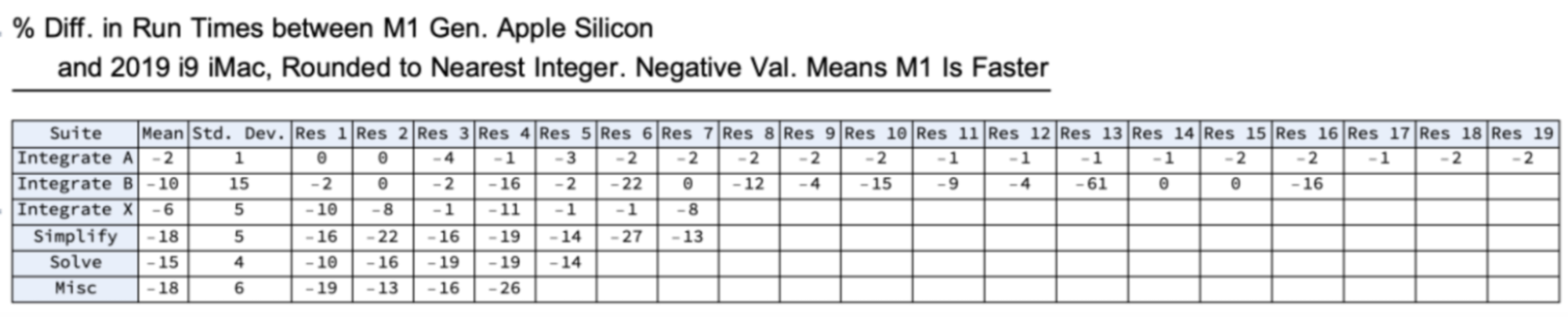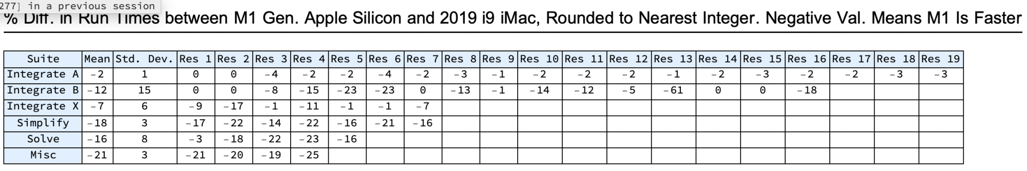 It's been opined that, to the extent Mathematica doesn't do well on AS vs. Intel, it's because AS's math libraries aren't as well optimized as Intel's MKL. Thus my upper table consists entirely of symbolic tasks and, indeed, all of these are faster on AS than my i9 iMac. However, they are not that much faster. You can see the M1 Max averages only 2% to 18% faster for these suites of symbolic computations.