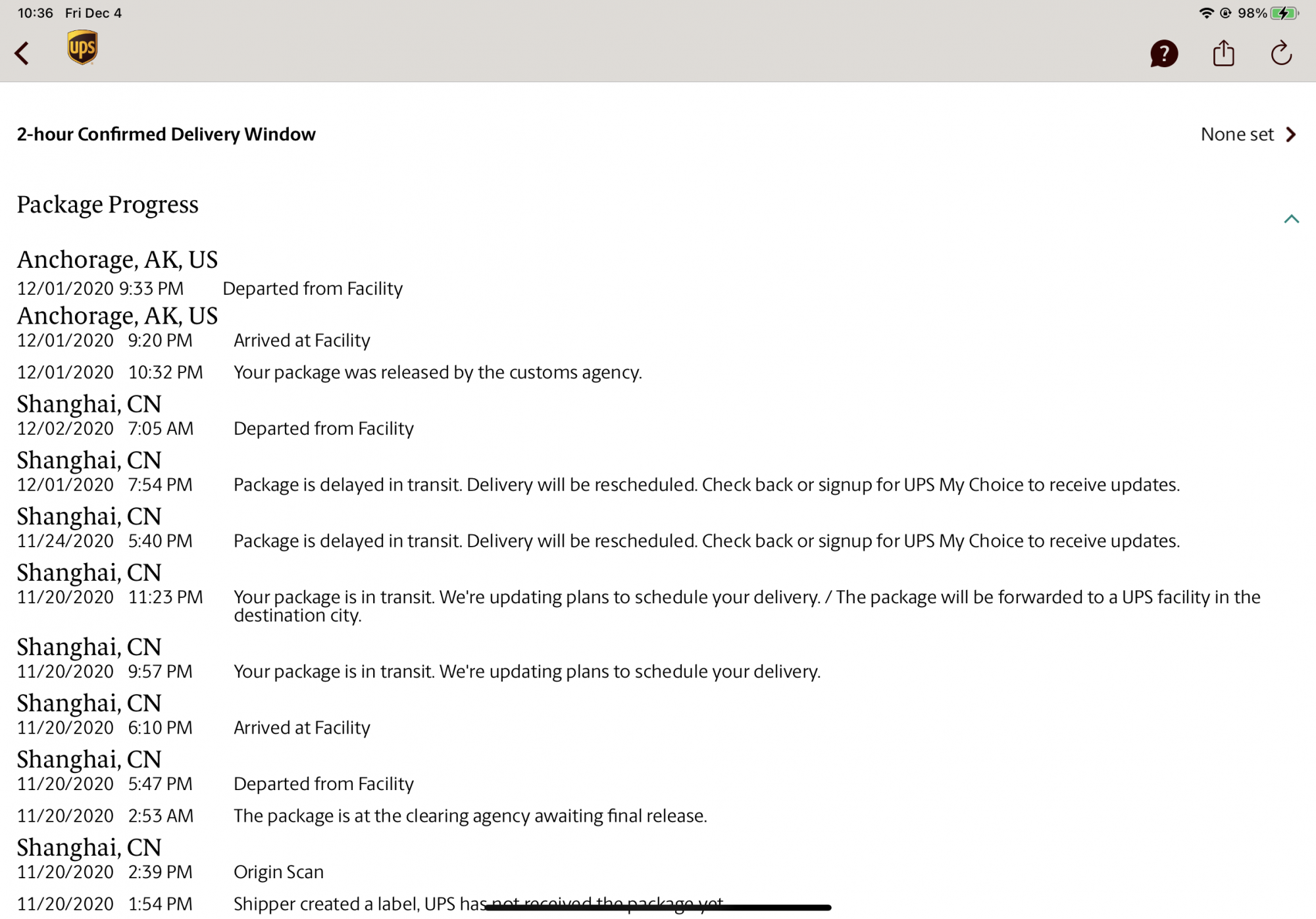 My 16/512 mini has been sitting in Hong Kong for several days, with no estimated delivery date from UPS. I noticed this morning that its status has changed to "Cleared Customs" and now has a delivery date of 12/9.