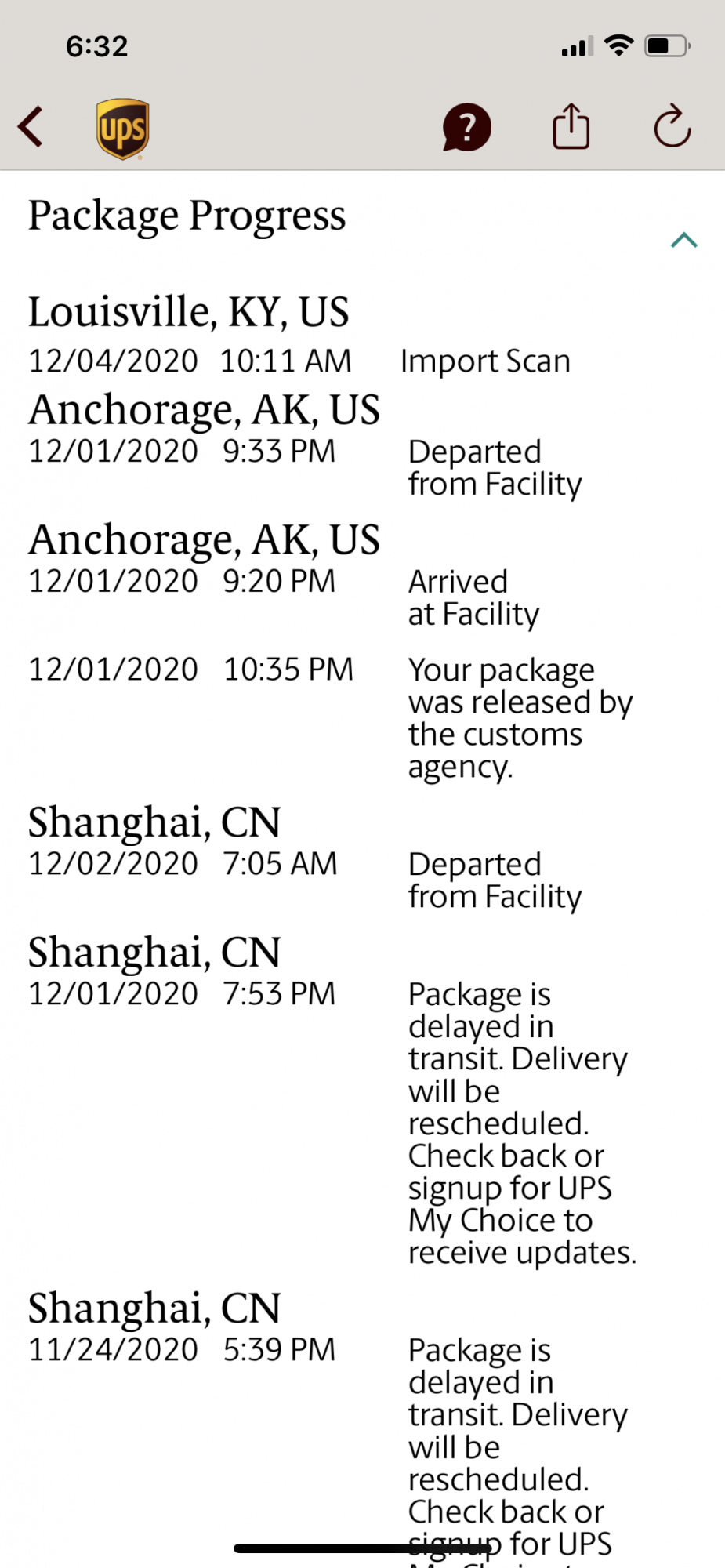 Now where I'm really confused is if I look at the UPS app. My original tracking number (from 11/18) says it made it to Louisville, KY around 1am. Still says it's shipping to my address with a delivery of EOD 12/7. My second tracking number (from the Apple automatic re-order from 11/27) finally shipped but the status is 'package is delayed in transit' and still in Shanghai. Main page of UPS app says the second order should be delivered 12/10. Finally, the Apple Store app uses the new tracking number and says it will be delivered on 12/22.