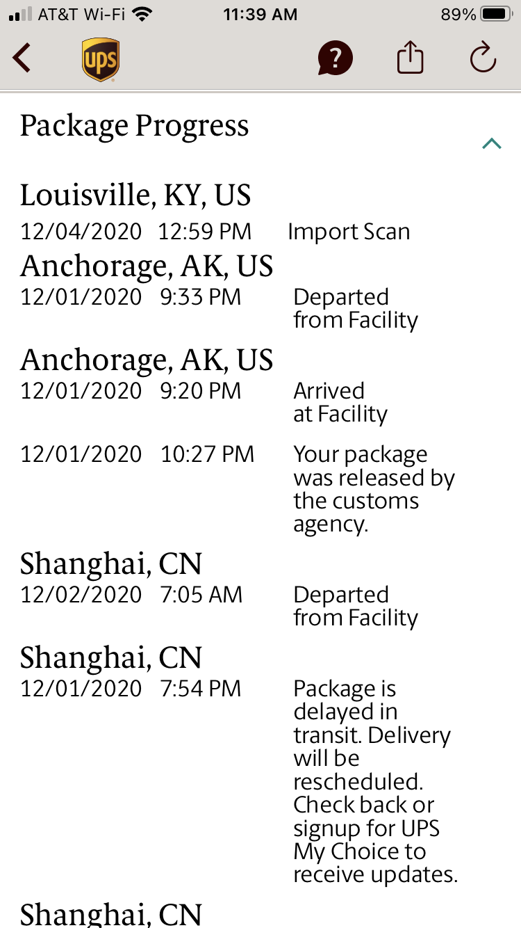 Now where I'm really confused is if I look at the UPS app. My original tracking number (from 11/18) says it made it to Louisville, KY around 1am. Still says it's shipping to my address with a delivery of EOD 12/7. My second tracking number (from the Apple automatic re-order from 11/27) finally shipped but the status is 'package is delayed in transit' and still in Shanghai. Main page of UPS app says the second order should be delivered 12/10. Finally, the Apple Store app uses the new tracking number and says it will be delivered on 12/22.