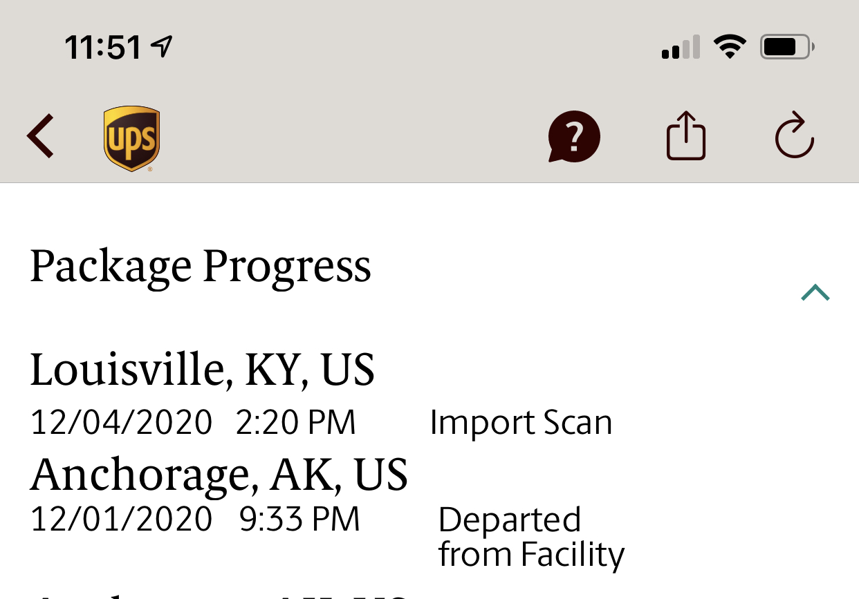 MM 16/512: Ordered 11/20, shipped 12/4 via UPS to USA. Apple shows 12/14 delivery, UPS shows 12/10. Shenzhen to Chek Lap Kok, Hong Kong ?????