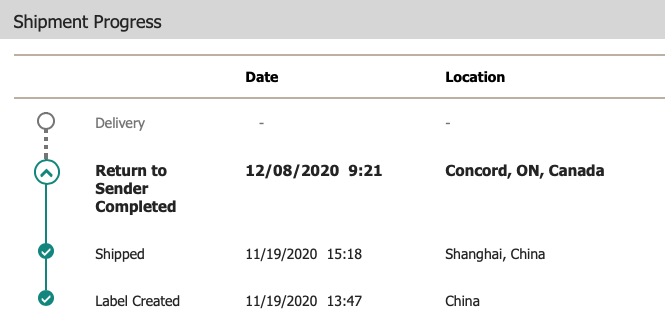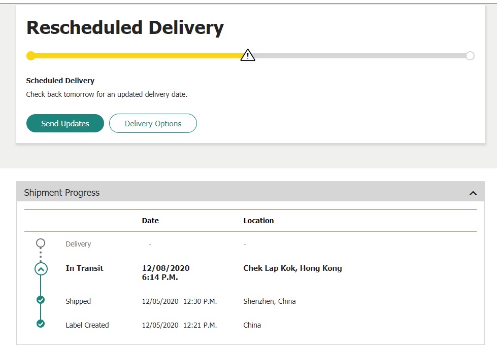 After being stuck in Shanghai for 2 weeks, the original package was found and sent on, and was due for delivery today.