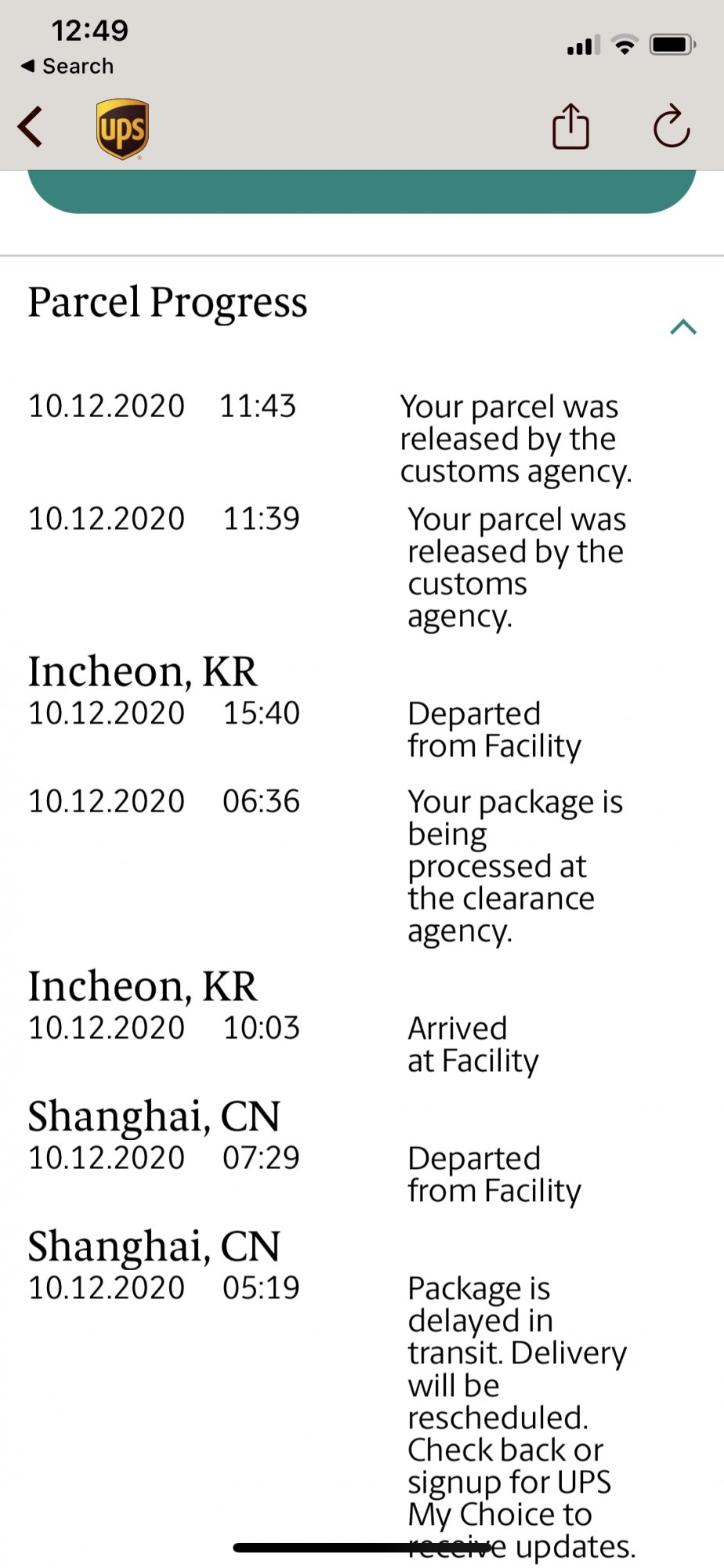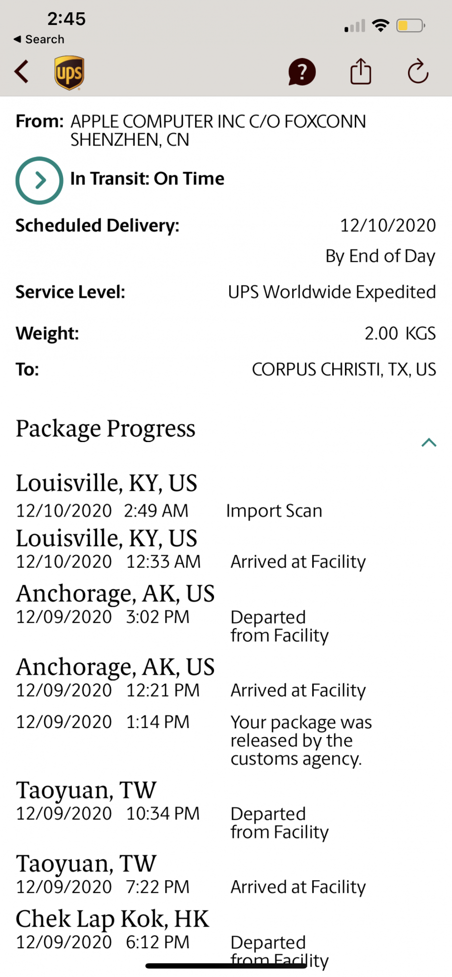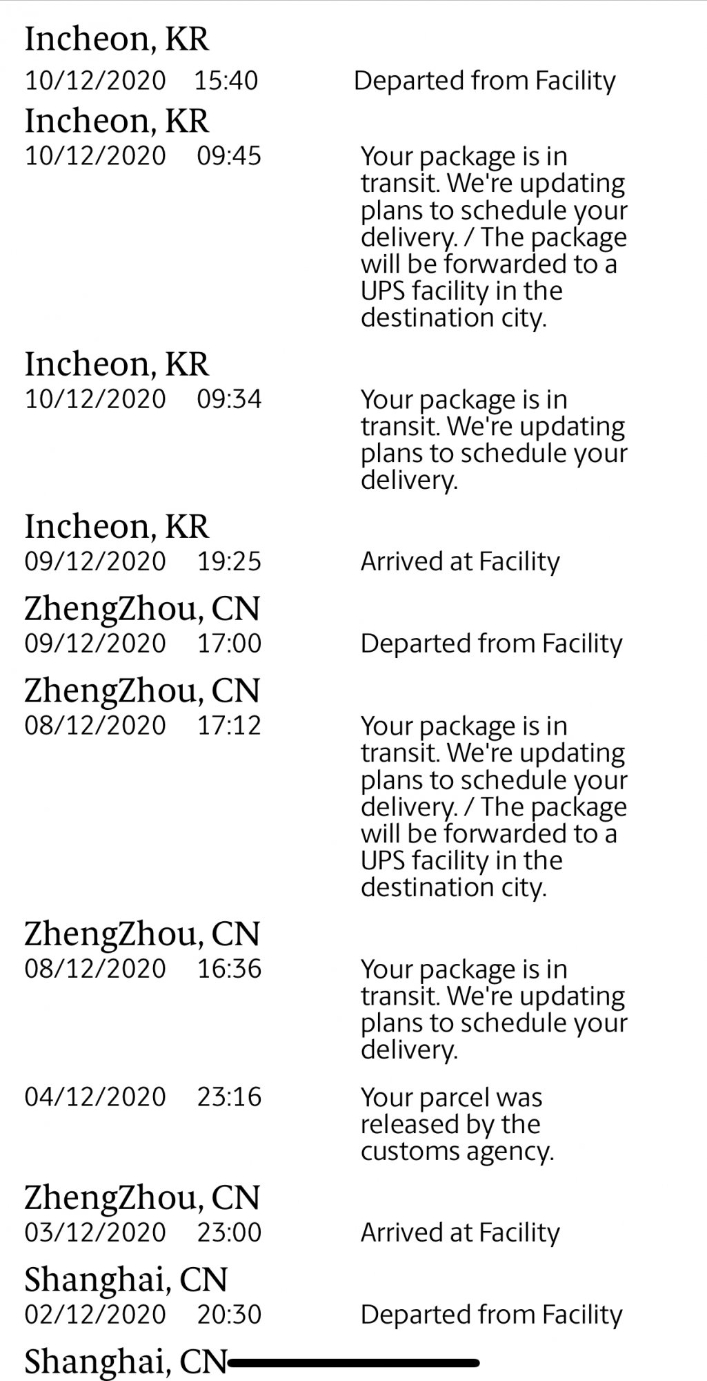 Looks like ours left at the same time, but mine doesn't have anything about clearing customs. I've checked what time flights to Cologne (next destination) were today, and apparently it was at 13:31 local time, meaning that if our packages didn't leave the facility until 15:40, we've missed the flight for today and so no chance of delivery tomorrow. Which is reflected by my order on the Apple website changing from "Arrives 11 Dec" to "Arrives soon" lol. Unless of course it's just UPS being its typical incompetent self and not updating tracking details on time, in which case we'll get an update after the flight lands (18:15 CET).