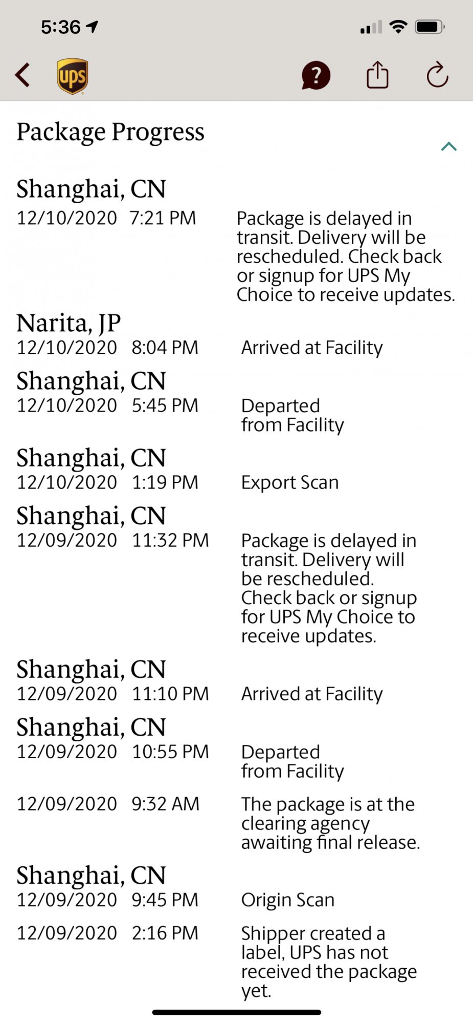 What do you think is the next step? It’s marked as shipped a couple of hours before the delay in transit scan, is it still in China or it landed in the US but it’s not scanned yet?