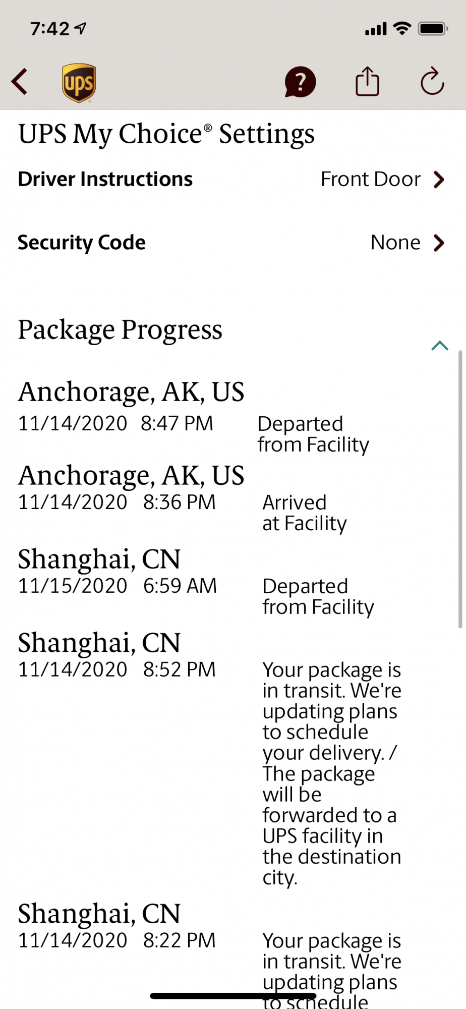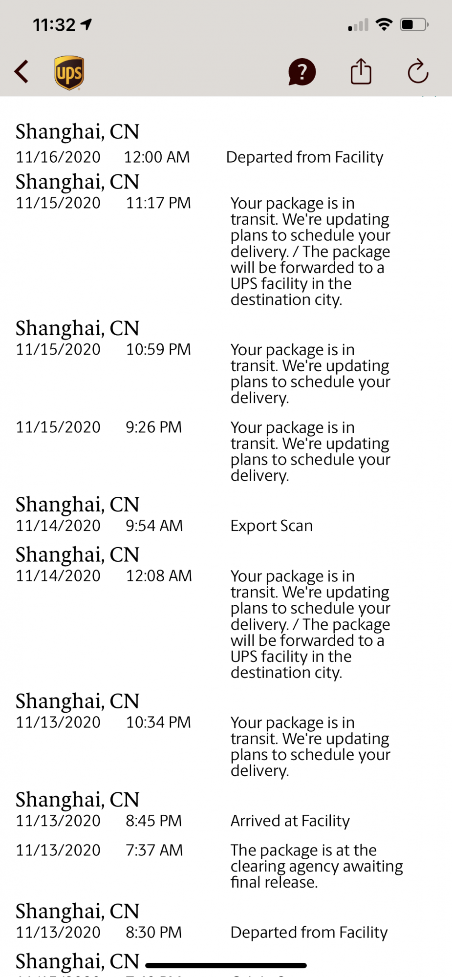 same here!!UPS Tracking is broken for me... 7 hours ago it was showing Export Scan in Shanghai but now it only shows "Your package is in transit. We're updating plans to schedule your delivery. / The package will be forwarded to a UPS facility in the destination city."