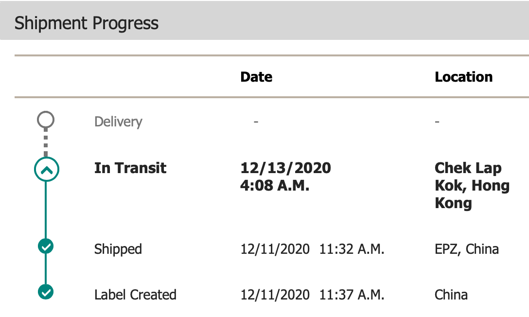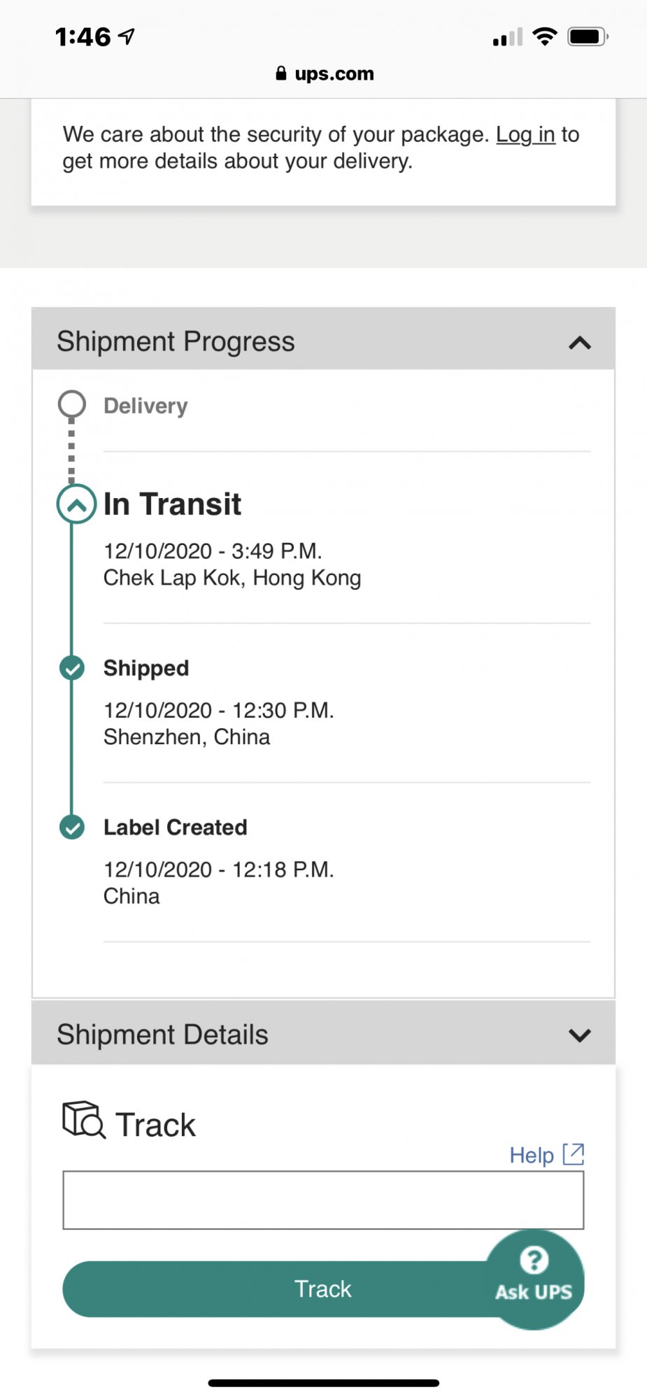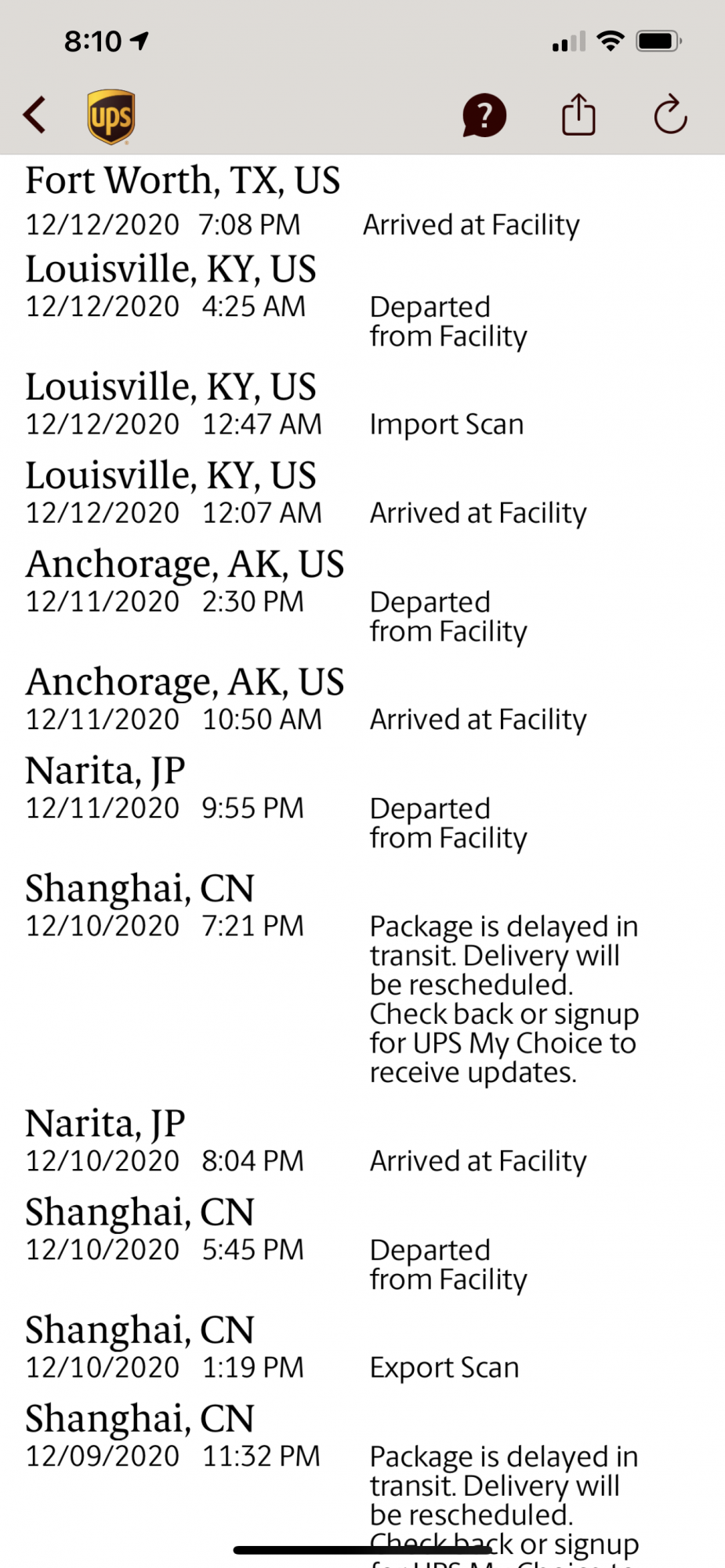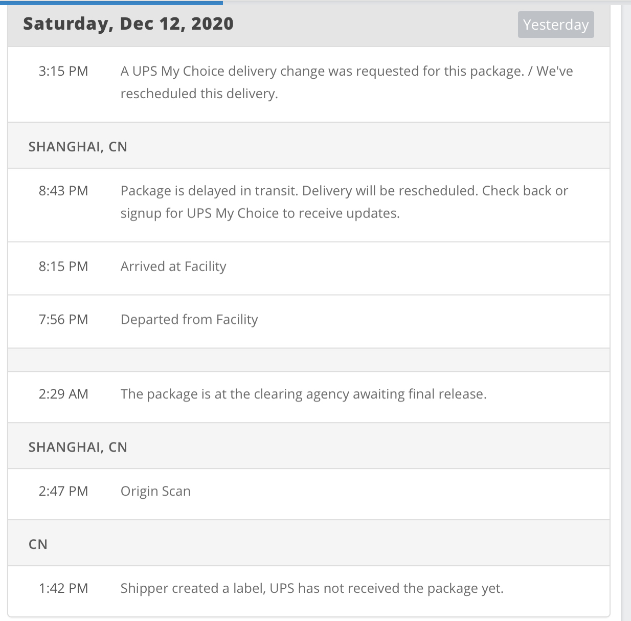 • It shipped out via UPS on 12/10 in Shanghai, and Apple's estimated delivery was now delayed to 12/21.