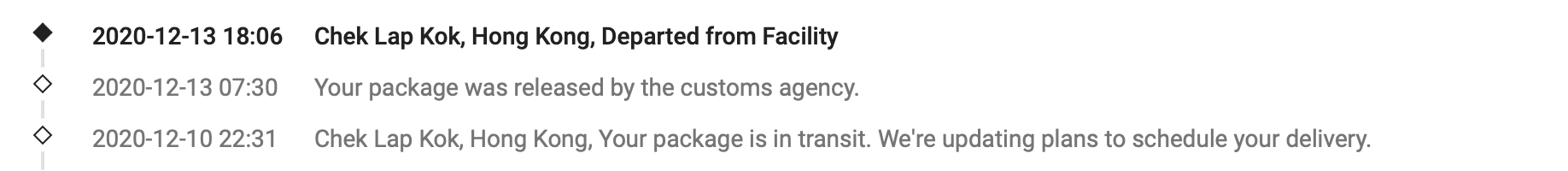 • It spent 12/11 in Shanghai with status "Package delayed in transit"