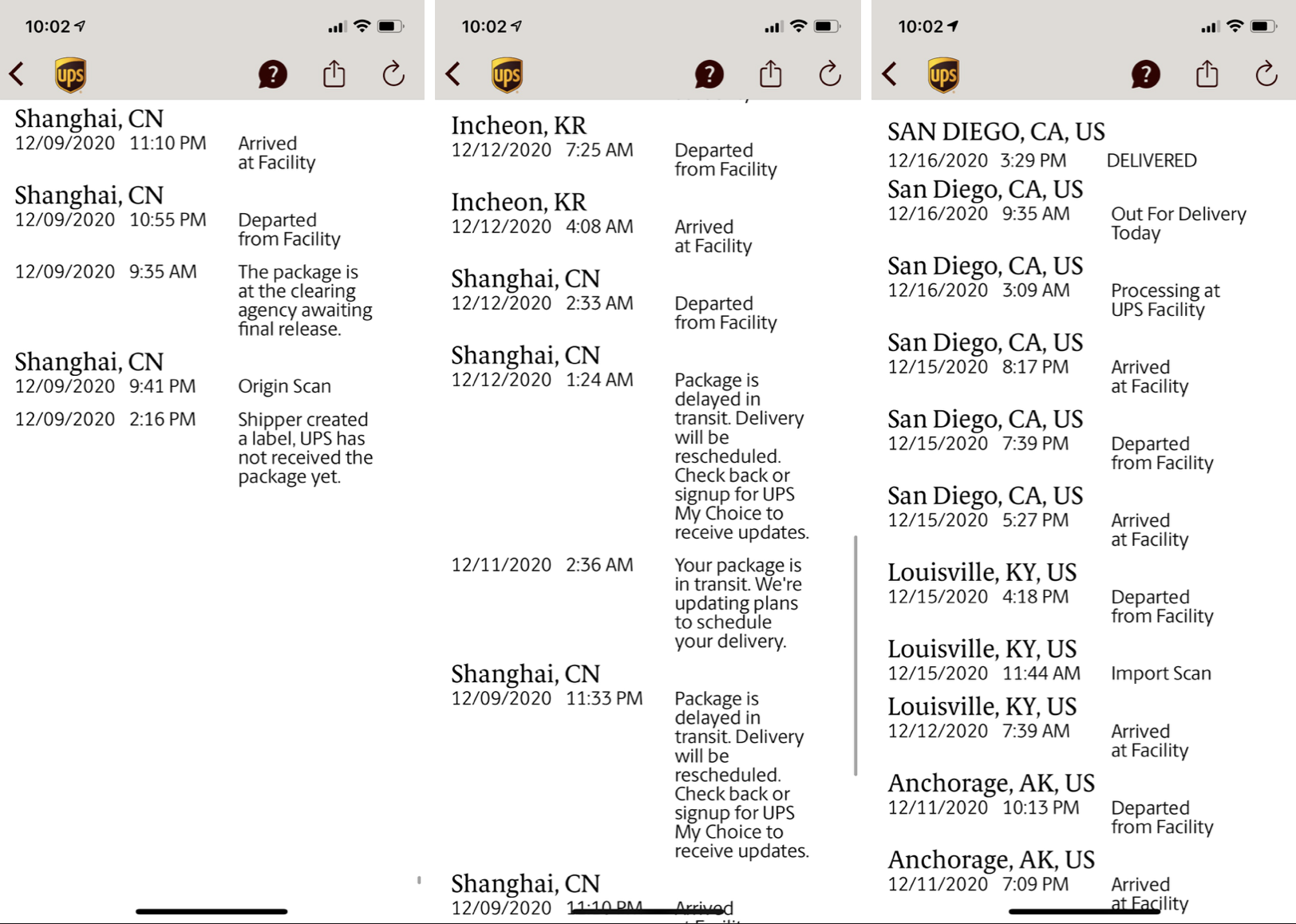 My package was expected to be delivered 17 December according to the UPS estimate and went the expected route from Shanghai -> Incheon -> Anchorage -> Louisville. After almost 24 hours in Louisville it's showing that it's back in Shanghai.