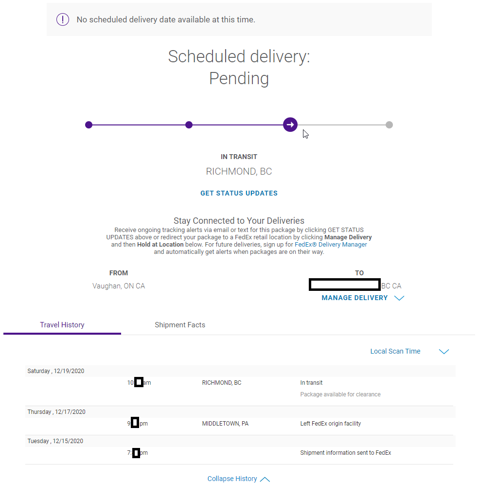 I'm close to Vancouver! My UPS hasn't updated since Shanghai though; what has your route looked like so far?So In looking at the Schedules for FDX 142 to Vancouver, it doesn't fly on Sunday and Monday. This means that if this package misses 2 more flights, it won't arrive until after 29th, which isn't a big deal. There just aren't very many flights between the hub and Vancouver, and I'm sure this time of year, they must be packed.